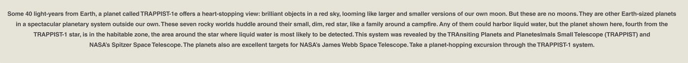 เพียง 40 ปีแสงจากโลก! ดาวเคราะห์นามว่า TRAPPIST-1e จะมอบทิวทัศน์ที่สวยจับใจ ด้วยเทหวัตถุสีแดงที่ลอยบนฟ้าสีแดงก่ำรูปลักษณ์ละม้ายดวงจันทร์ที่เล็กและใหญ่กว่ากัน แต่นั่นไม่ใช่ดวงจันทร์ แต่เป็นดาวเคราะห์ขนาดใกล้เคียงโลกที่อยู่นอกระบบสุริยจักรวาล ดาวทั้ง 7 เกาะกลุ่มรอบดาวฤกษ์สีแดงมัวเล็กๆ (ดาวแคระแดง) เหมือนครอบครัวที่ล้อมวงรอบกองไฟ....