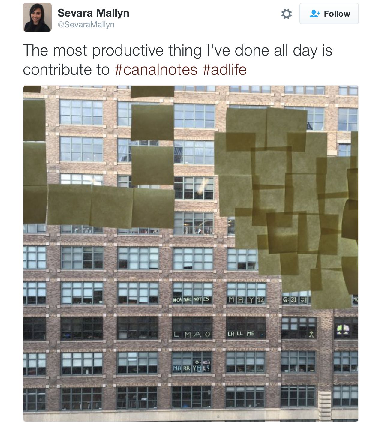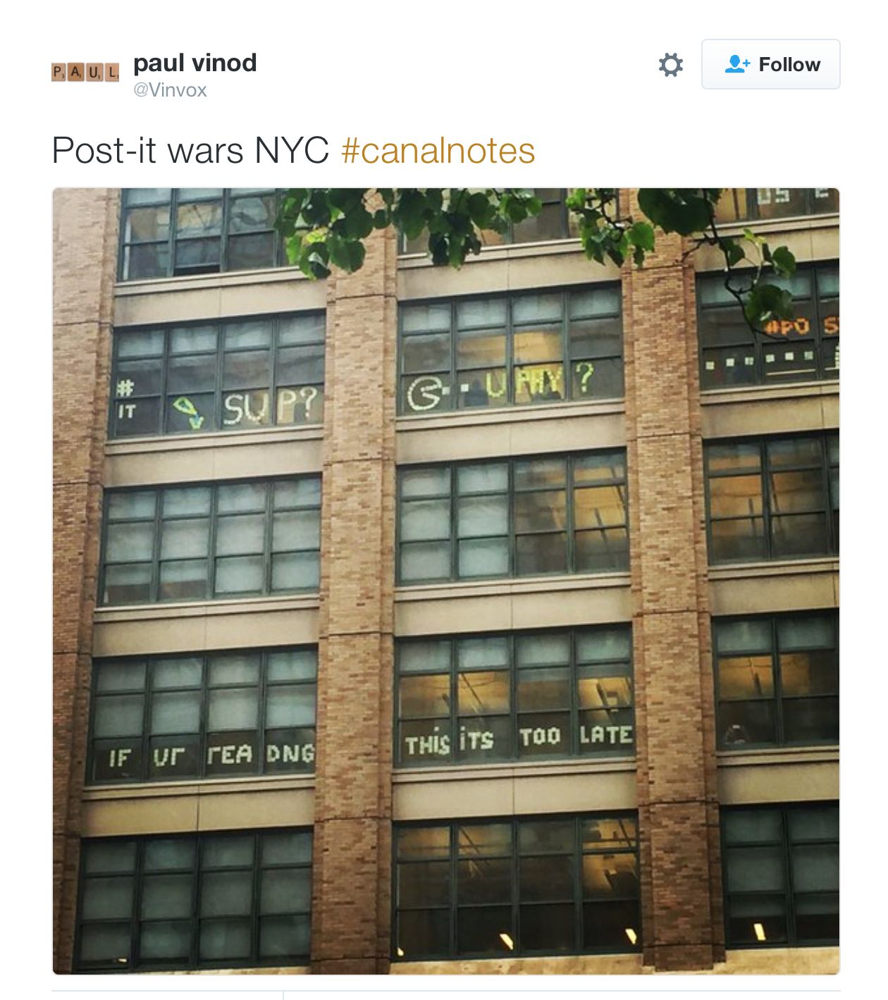กลายเป็น #canalnotes หรือ #postitwar (บางคนก็ใช้ #postitwars) กิจกรรมเหล่านี้เรียกความสนใจจากผู้คนในนิวยอร์กและสำนักข่าวได้อย่างดีเลย (แต่คนเล่นไม่สนใจหรอก สนแค่การโต้กลับของตึกตรงข้าม ใช่มั้ย?)