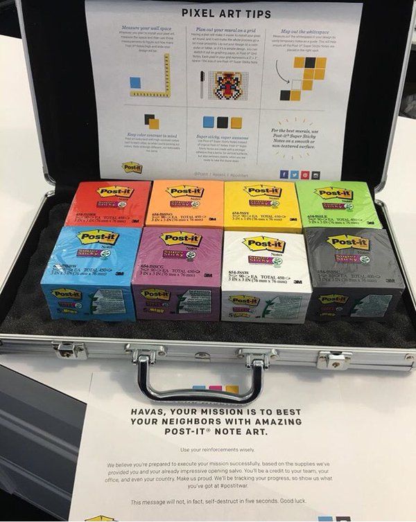 บริษัทผู้ผลิต Post-it ออกโรงมาด้วยตัวเอง! พร้อมกระเป๋าโลหะดั่งกระเป๋าใส่อาวุธสงครามในหนัง เมื่อเปิดมาก็เจออาวุธ(?)หลากสีที่พร้อมจะให้บริษัททั้งหลายประหัตประหารกันทางไอเดียแล้ว! มินิมอร์ชอบคู่มือการสร้างพิกเซลอาร์ทมาก นี่ฝ่ายกราฟฟิคฝ่ายอาร์ทของโพสต์อิททำงานเร็วไปมั้ยอะ