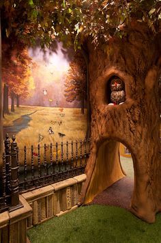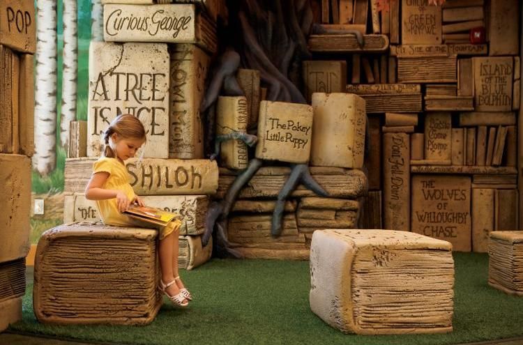 ภายในโซนของเด็ก กำแพงทุกด้านถูกเนรมิตให้กลายเป็นภาพวาดของเทพนิยาย และมีต้นไม้เทียมแทรกตามแถวชั้นวางช่วยเพิ่มเสน่ห์แห่งการเรียนรู้