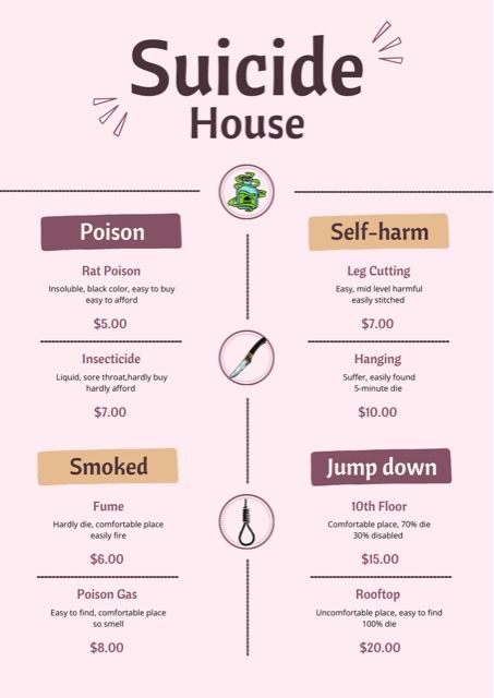 คนซึมเศร้าในวันเศร้าซึม ไม่ว่าจะทำอะไรความคิดที่มีในหัวสมองมันก็บิดเบี้ยวไปหมด แต่ฉันเชื่อว่าฉันคิดถูก นี่คืออีก 1 สัจธรรมที่ต้องยอมรับให้ได้; ไม่มีใครอยากเคียงข้างฉันหรอก ฉันปาดน้ำตา สูดน้ำมูกแล้วมองลงไปยังชั้น 1 ของคอนโด มองจากตรงนี้มันช่างสูงดี แต่วันจริง ฉันคงขึ้นไปชั้น 29 ราวบันไดที่กั้นนี้มันสูงจังเลยนะ คงปีนยากน่าดู ฉันคงเอาเก้าอี้ไปช่วยปีนด้วย ฉันจะกรีดน่องข้างขวาที่ยังว่างอยู่ ให้เลือดชั่วในตัวมันไหลออกมากองข้างนอก แล้วก้าวขาออกไปเหยียบอากาศอันว่างเปล่า ฉันจะหล่นลงไปหัวระเบิดติดพื้นปูนอยู่ที่ชั้น 1 และฉันจะไม่มีความรู้สึกกลัว, ไม่รู้สึกเจ็บ, ไม่รู้สึกกดดัน, ไม่มีความคิดว่าเป็นภาระ และสุดท้ายฉันจะไม่หายใจอีกเลย