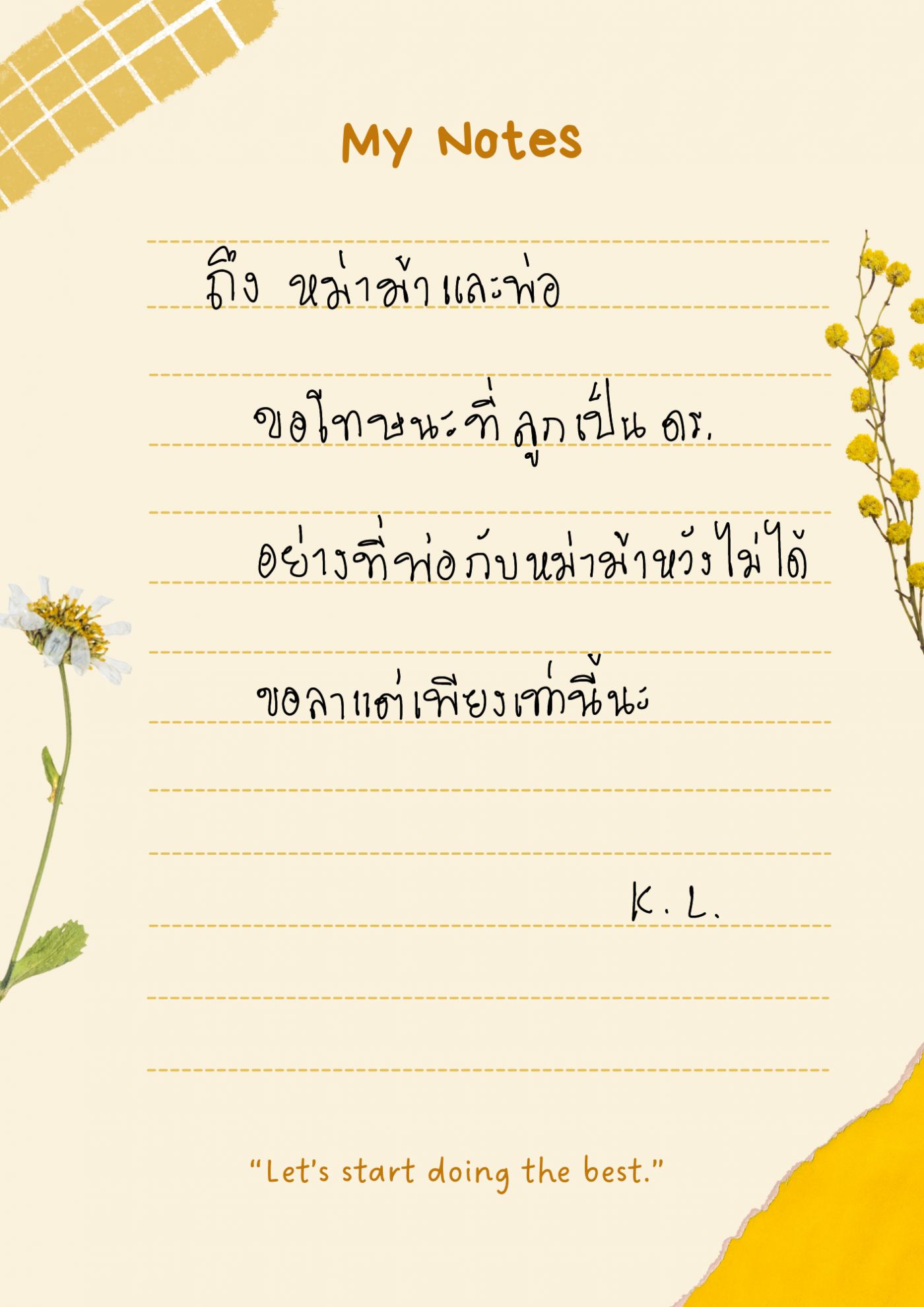 มาถึงวันนี้ถึงแม่จะละทิ้งความฝันอันนั้นไปแล้ว เพราะเห็นว่าฉันโดนโรคร้ายรุมเร้าเกินกว่าจะเรียนอะไรได้อีก ฉันเองก็เช่นกัน เคยถอดใจแล้วว่าชาตินี้คงทำตามความฝันของแม่ไม่ได้ แต่ในวันนี้ความหวังนั้นมันผุดพราวขึ้นมาในหัวสมองของฉันเหมือนฟืนที่มอดดับแล้วจู่ๆไฟก็ติดพรึ่บขึ้นมาซะอย่างนั้น อย่างน้อยก็ต้อง ดร. ฉันจะคว้ามันมาให้แม่ให้ได้