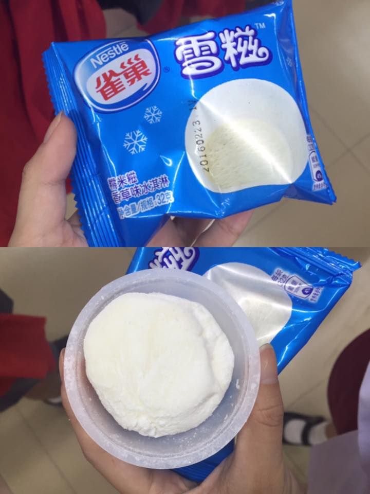 มีวันนึงเราอยากกินไอติม เลยไปคุ้ยๆอยู่ที่ตู้ไอติม ตาสะดุดไปเจอไอติมอันนึงกลมๆน่ารักๆราคาก็น่ารักกว่าอันอื่น เลยหยิบไปลองชิม บอกเลยยย "อร่อยมากกกกกกกกกกกกกกกก" มันเป็นไอติมวนิลาข้างในโมจินุ่มๆโรยแป้งนิดนึงกรุ่บกริบๆ เลยแนะนำเพื่อนๆเลยซื้อกินกันวันละลูกจนมันหมดตู้ หาซื้อที่อื่นก็ไม่มี เมืองอื่นก็ไม่มี เสียใจแรงมากกกกกก ประมาณ 2 หยวนนิดๆ ถ้าซื้อของเยอะแนะนำเอาถุงไปด้วย ไม่อย่างนั้นจะคิดตังค์เพิ่มนะ เนื่องจากเราขี้งกก็แบกกลับทุกครั้งไม่เคยซื้อถุงเลยไม่รู้ว่ามันราคาเท่าไหร่ 5555