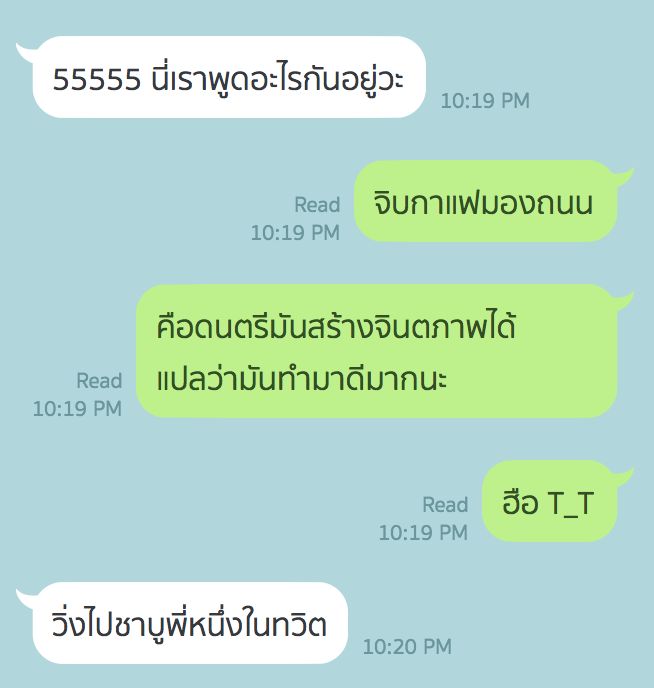 เนี่ย ที่อยากพูดมีแค่นี้ 5555 จริงๆ นะ รู้สึกดีที่ได้ฟังเพลงซึ่งทำให้เห็นภาพบางอย่างชัดขนาดนี้ มีไม่บ่อยหรอกนะ แต่ถ้าทำได้แปลว่าเจ๋งดี