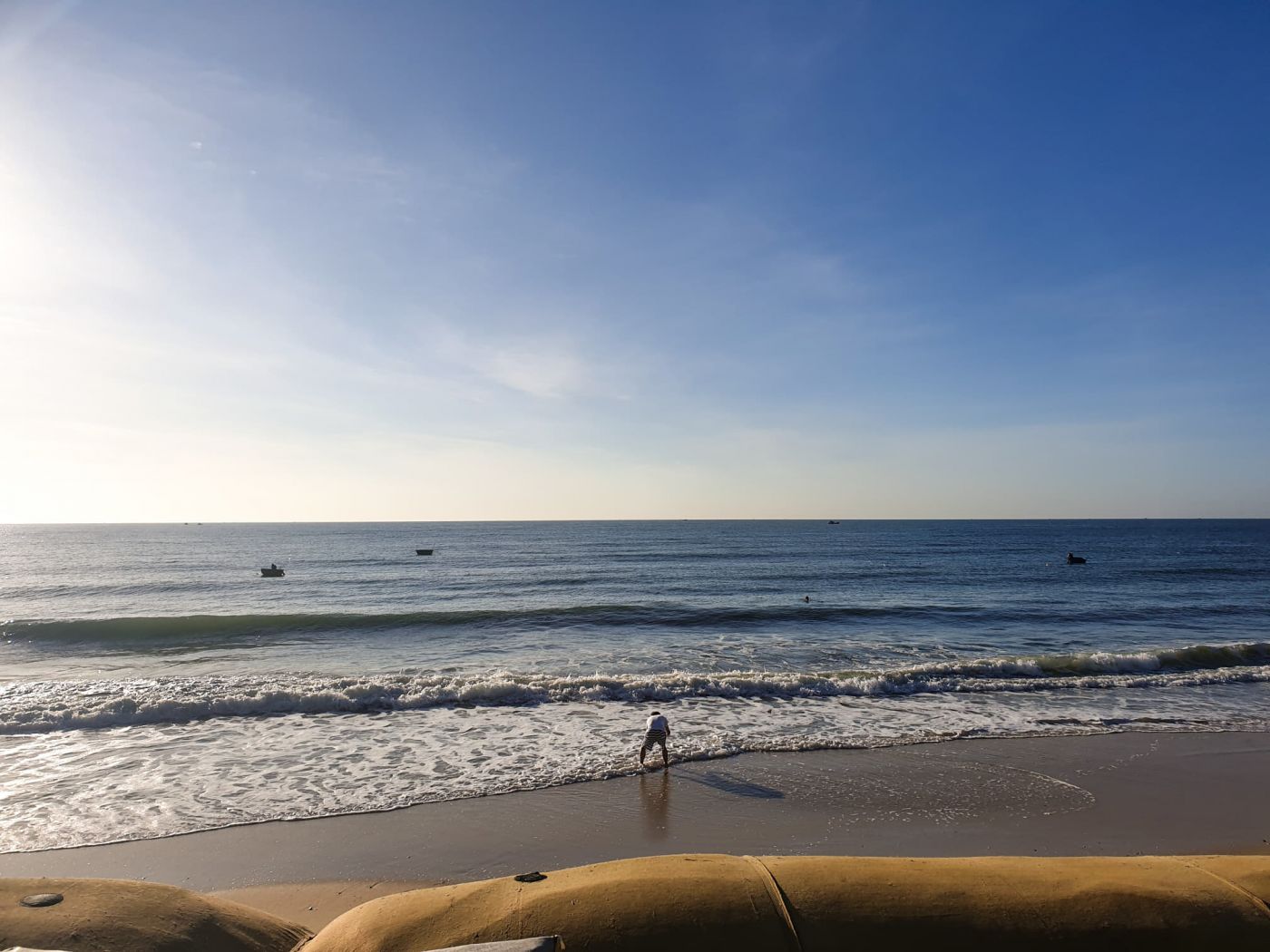 เนื่องจากทัวร์เริ่มตอนบ่าย 2 ครึ่ง ทำให้เรามีเวลาว่างช่วงเช้าไปเดินเที่ยวริมทะเล จากที่พักแค่ข้ามถนนไปฝั่งตรงข้ามก็ถึงทะเลเลย ทะเลที่นี่มีพื้นที่ชายหาดน้อย เนื่องจากคลื่นซัดขึ้นมาค่อนข้างสูงทำให้บริเวณชายหาดมีที่กั้นคลื่นวางอยู่ตลอดแนว อีกทั้งที่นี่ลมค่อนข้างแรง ทำให้คนนิยมมาเล่นKite surf กันเป็นจำนวนมาก พวกเราก็เลยนั่งชิลๆริมทะเลมองเขาเล่นกัน ทะเลที่นี่น้ำสีฟ้าสวยมาก+ลมแรงตลอดเวลาทำให้นั่งเล่นได้เพลินๆ
