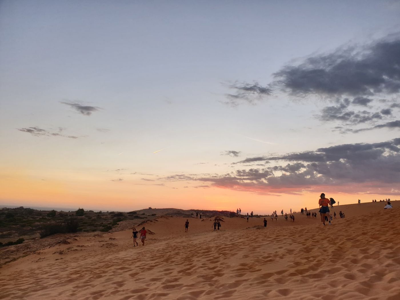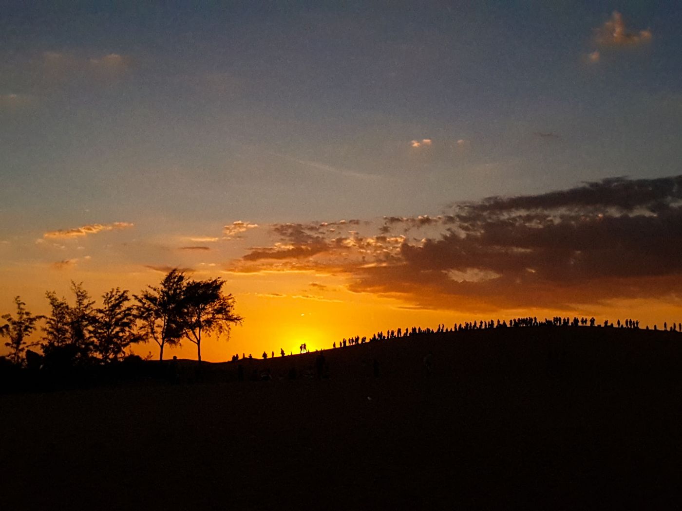 หลังจากนั้นก็มาถึงที่สุดท้ายคือ Red sand dunes ตอนที่พระอาทิตย์กำลังตกดินพอดี พวกเราก็รีบกึ่งเดินกึ่งวิ่งไปดู ด้วยว่ากลัวจะไม่ทันเพราะตอนที่มาถึงพระอาทิตย์ก็เริ่มตกไปบ้างแล้ว ทำให้ฉันได้รู้ว่าการเดินบนทะเลทรายมันเหนื่อยมากก พอเดินไปได้สักพักคิดว่าคงไปไม่ถึงริมสุดแน่ เลยหาที่ยืนดูกัน ถึงแม้จะไม่เห็นพระอาทิตย์เต็มๆ แต่ท้องฟ้าบวกกับวิวทะเลทรายก็สวยมากก ทำให้ฉันประทับใจมาก จากที่เห็นทะเลทรายแดงขนาดเล็กกว่าทะเลทรายขาวมาก ตัวทะเลทรายอาจจะสวยน้อยกว่าทรายขาว แต่ก็ยังสวยอยู่ดีในความคิดของฉัน เรายืนดูพระอาทิตย์ตกจนลับขอบฟ้าไป หลังจากนั้นท้องฟ้าก็มืดทันที พวกเราเลยเดินกลับไปที่รถเพื่อกลับที่พักกัน