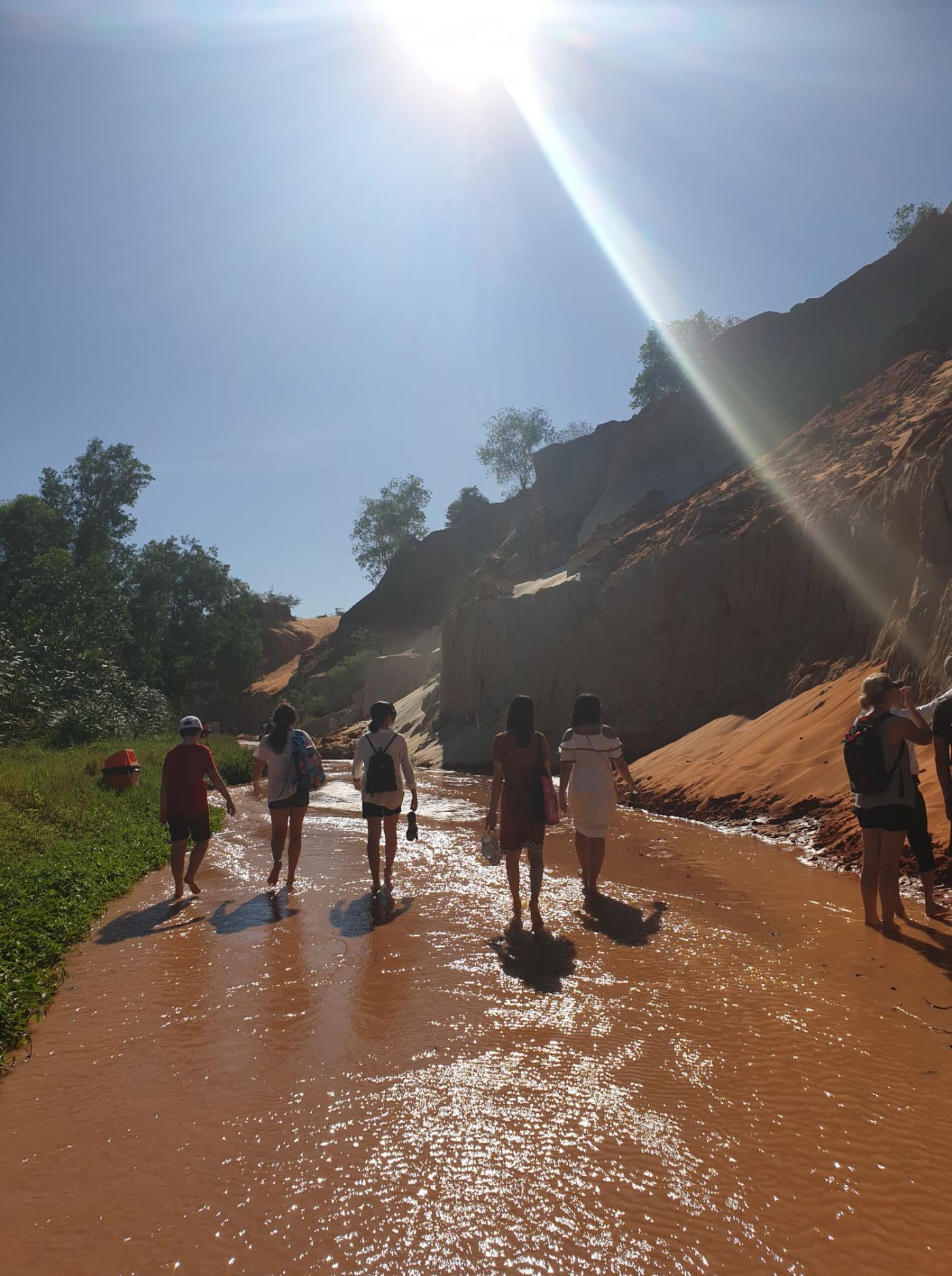 พอกินเสร็จก็มาขึ้นรถjeepตามที่จองทัวร์ไว้ เนื่องจากพวกเรามากัน 4 คน เลยจองทัวร์แบบprivateกัน ข้อเสียคือคนขับรถพูดอังกฤษแทบไม่ได้เลย บางทีเลยสื่อสารกันค่อนข้างลำบาก เขาพาเราไปFairy streamเป็นที่แรก น่าจะเพราะอยู่ใกล้สุด พอไปถึงก็ต้องเสียค่าเข้า ถ้าจำไม่ผิดน่าจะประมาณ 15,000 ดอง ทีนี้ก็เดินลงบันไดจนไปถึงทางน้ำ ตรงปลายบันไดเราจะเจอที่ฝากรองเท้า ถ้าฝากจะต้องเสียเงิน ดังนั้นจึงแนะนำให้ถือไปก็ได้ ระหว่างทางเดินเข้าไปจะเป็นเหมือนแม่น้ำตื้นๆ ทั้งสองข้างทางจะมีร้านขายเครื่องดื่มและขนมประปราย นอกจากนี้ยังมีบริการให้ขี่นกกระจอกเทศอีกด้วย พอเดินลึกเข้าไปเรื่อยๆทั้งสองฝั่งจากที่เป็นป่าก็จะเริ่มเป็นหน้าผาหินทราย(?)สีขาว ตอนไปที่นี่แนะนำให้ใส่แว่นกันแดดไปด้วย เพราะว่าลมพัดทรายเข้าตาเต็มๆ แสบตามาก พอเดินไปเรื่อยๆทางฝั่งขวาก็จะเป็นหน้าผาหินทรายสีขาว รูปร่างเหมือนพวกหินงอกหินย้อยแปลกตาดูสวยดี พวกเราไม่ได้เดินเข้าไปจนสุดเพราะกลัวเวลาไม่พอไปที่อื่นๆ หลังจากเข้าไปไม่นานก็เดินย้อนกลับมาขึ้นรถ