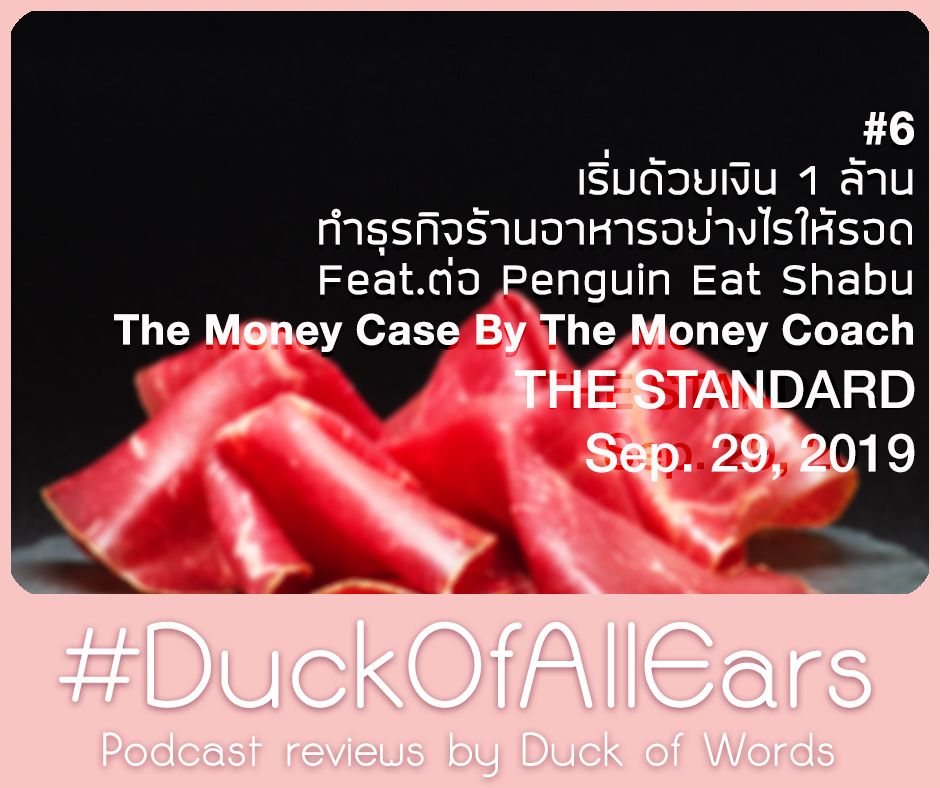 อันที่จริง ถ้าใครติดตามพอดแคสต์ในเครือ THE STANDARD อาจพบว่า The Money Case By The Money Coach ตอนนี้อาจมีกลิ่นไอคล้ายกับรายการ The Secret Sauce ที่อยู่ร่วมสังกัดกันขึ้นมาบ้าง เพราะแขกรับเชิญของโค้ชหนุ่มและคุณโอมในคราวนี้ไม่ใช่ผู้เชี่ยวชาญด้านหุ้น กองทุน ระบบภาษี หรือผู้ให้คำปรึกษาทางการเงินใดๆ แต่เป็นเจ้าของธุรกิจที่ผ่านการทำงานลองผิดลองถูก จนได้แนวคิดที่น่าสนใจหลายข้อมากทีเดียวค่ะ ในฐานะคนที่สนใจด้านธุรกิจและความรู้ทางการเงินคนหนึ่ง เรารู้สึกว่าวิธีการคิด การวางแผนก่อร่างสร้างกิจการของคุณต่อจนได้แบรนด์ร้านอาหารชาบูชาบูที่ประสบความสำเร็จมีความละเอียด ละเมียดละไม เห็นที่มาและที่ไปชัดเจน และน่าลองไปประยุกต์ใช้ในการประกอบธุรกิจได้แทบทุกชนิด เป็ดชอบคุณต่อมากที่คิดละเอียดตั้งแต่การเลือกทำเลที่ร้าน การเลือกวัสดุตกแต่งร้านและโต๊ะเก้าอี้ที่ราคาถูกแต่มีประสิทธิภาพ การคำนวณรายได้ที่ควรจะได้รับและระยะเวลากว่าจะถึงจุดที่สร้างกำไรคืนทุนได้ ไปจนถึงการตั้งชื่อและหามาสคอตร้าน ที่ดูเผินๆ อาจจะเหมือนคิดเล็กคิดน้อยจุกจิก แต่คุณคะ นี่แหละคือหนึ่งในตัวอย่างของการคิดมาก คิดละเอียดแล้วเกิดประโยชน์ที่ดี ถึงขั้นที่ว่าตอนนี้เป็ดเองก็ตามเพจของคุณต่อไปแล้วเรียบร้อยค่ะ สำหรับใครที่กำลังสนใจทำธุรกิจ (โดยเฉพาะร้านอาหาร) ทั้งในกรณีที่มีเงินทุนเหลือเฟือหรือเงินทุนจำกัดอย่างตัวคุณต่อเองในระยะเริ่มต้น เป็ดก็อยากจะแนะนำตอนนี้ให้ทุกคนได้ลองฟังเป็นอย่างยิ่งเลยค่ะ