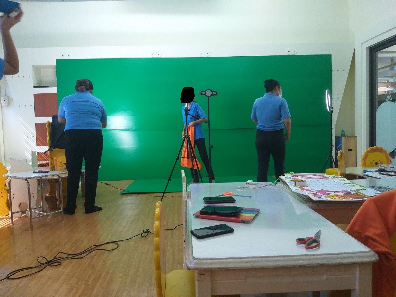 หลังจากผ่านพ้นการพัฒนาฝีไม้ลายมือระบายสีไม้และสีน้ำแล้ว เราก็ได้เข้าสู่เสตจต่อไปค่ะ! เนื่องจากพวกพี่ ๆ เห็นสมควรว่าเด็กสองคนคงระบายสีกันจนเบื่อแล้วเป็นแน่แท้ ก็ได้ชวนเรากับเพื่อนไปดูงานถ่ายวีดีโอสอนออนไลน์กันค่ะ ด้วยความี่โควิดยังไม่หายแต่เด็ก ๆ ยังต้องเรียนรู้กันอยู่ ถึงจะเปิดโรงเรียนให้น้อง ๆ เข้ามาเรียนไม่ได้แต่ก็ยังมีวีดีโอสอนออนไลน์ให้เด็กได้ดูระหว่างที่อยู่บ้านค่ะ รวมทั้งมีแจกอุปกรณ์ต่าง ๆ ส่งไปให้ทางบ้านของแต่ละคนเพื่อประดิษฐ์ชิ้นงานอีกด้วย