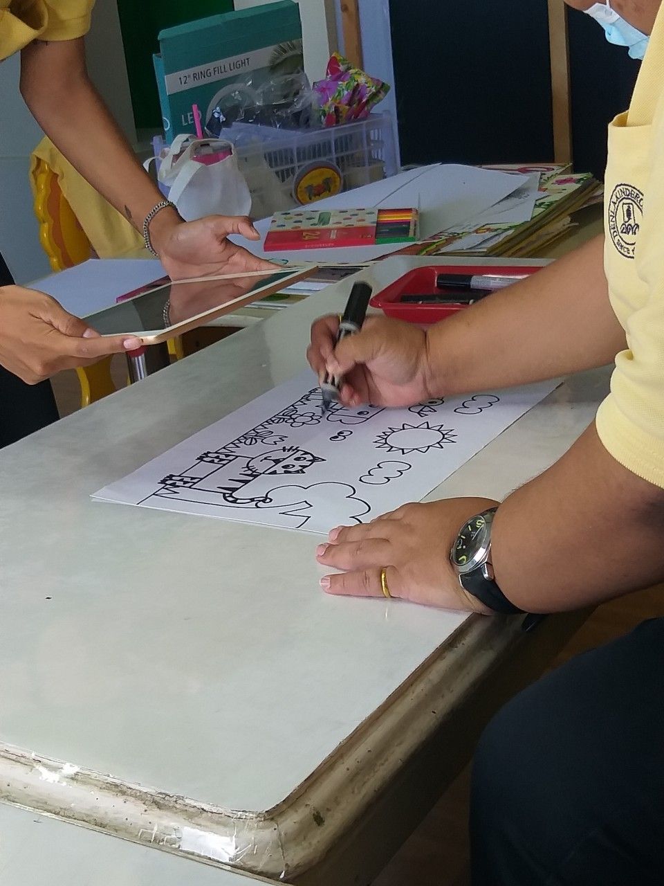 หลังจากถ่ายช่วงเต้นเสร็จเรียบร้อย ก็จะเข้าสู่ช่วงสอนวาด จะวาดเริ่มต้นจากรูปเรขาคณิตง่าย ๆ แต่ไม่ง่ายตรงที่ตอนถ่ายพี่เขาวาดรูปกลับหัวนี่แหละ...สุดยอดไปเลย เราแค่วาดปกติยังเบี้ยว แต่พี่เขาวาดกลับหัวยังเหมือนกันทุกรูปที่วาดเลย เสร็จแล้วก็จะให้ระบายสีโดยการจับคู่สีเหมือนี่เรากับเพื่อนได้ทำมาตั้งแต่ฝึกงาน เพื่อให้เด็ก ๆ รู้จักจับคู่สี