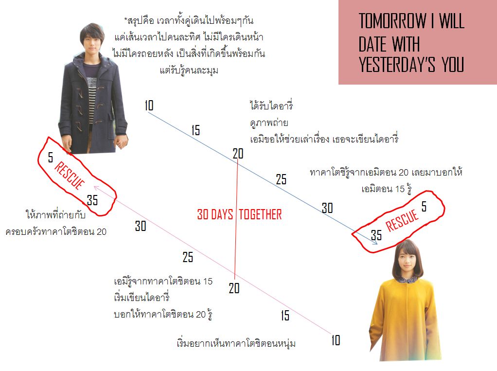ดังนั้นเท่ากับทั้งสองมีแค่ 30 วันที่สามารถสร้างความทรงจำให้อดีตและอนาคตของกันและกันได้ เพราะว่าอย่างที่เราเห็นว่ายิ่งเวลาผ่านไปเอมิยิ่งไม่รู้สึกถึงความรักระหว่างทั้งสอง เพราะสำหรับเธอมันยังไม่เกิดขึ้น ในขณะเดียวกัน วันแรกที่เจอกับทาคาโตชิ เอมิร้องไห้มากมายขนาดนั้นเพราะรักทาคาโตชิมาก และเป็นวันสุดท้ายก่อนจะแยกจาก