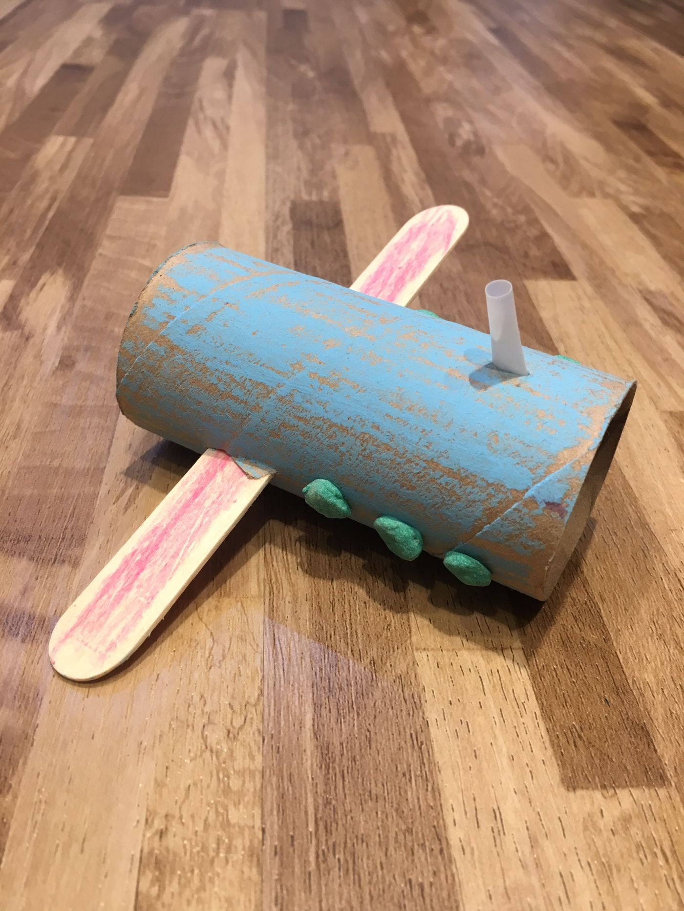 เริ่มต้นจากการทำ Airplane Craft : นำแกนกระดาษทิชชู่มาระบายสี และใช้ไม้ไอติมมาติดเป็นปีก เสียบหลอดไว้ และปั้นแป้งโดมาติดเป็นหน้าต่าง