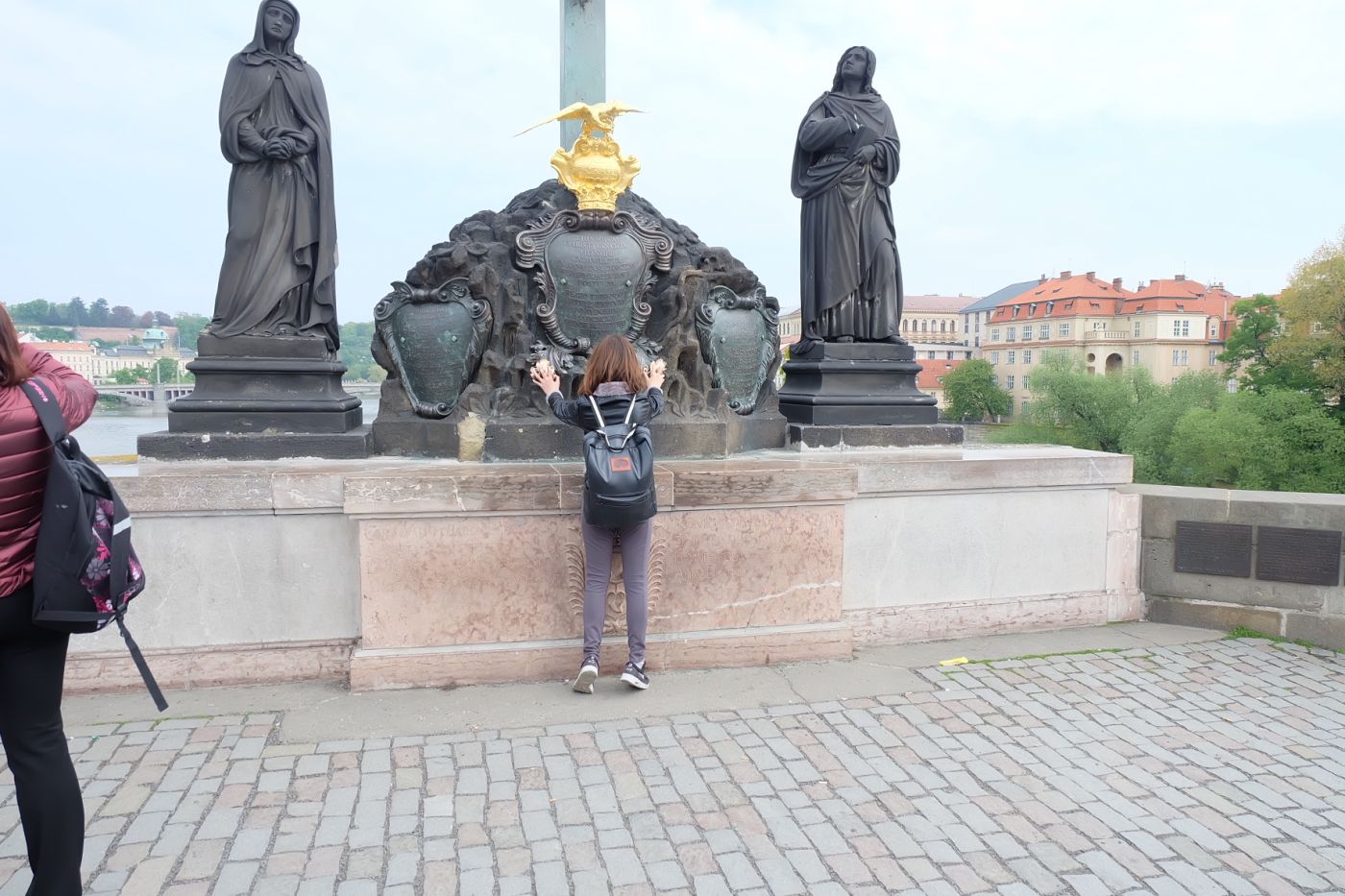 มาถึงจุดขอพรแล้วตรงรูปปั้นข้างหลังนั้นเองจริงๆแล้วมีเรื่องราวที่เราพอจำได้ในสมัยหนึ่งมีกษัตริย์กับพระราชินีในเช็กอยู่ปกครองบ้านเมืองสงบสุข แต่อยู่มาวันหนึ่งพระราชินีได้เข้าไปในโบสถ์ได้ทำการสารภาพซึ่งการจะสารภาพบาปเราจำเป็นต้องมีบาทหลวงคอยรับฟังแล้วบังเอิญมีคนไปเห็นแล้วเอาไปบอกพระราชา พระราชาก็เลยไปถามพระราชินีแต่พระราชินีไม่ยอมปริปากพูดท่านจึงสั่งให้คนไปสืบว่าใครคือบาทหลวงที่อยู่ในโบสถ์วันนั้น แล้วท่านก็สืบจนพบตัวแล้วได้ถามกับบาทหลวงผู้นั้น บาทหลวงท่านไม่ตอบเพราะเป็นเรื่องส่วนตัวของพระราชินีและท่านก็ไม่สมควรพูดตามหน้าที่ของท่าน ดังนั้นพระราชาจึงสั่งประหารชีวิตบาทหลวงคนนี้โดยจับถ่วงน้ำกับสะพานชาส์ล หลังจากทำการประหารเสร็จได้มีหมู่ดาวที่มีรูปร่างคล้ายท่านบนฟ้า พระราชาเกรงกลัวบาทหลวงจึงได้ปั้นรูปปั้นแล้วกลายเป็นที่ยึดเหนี่ยวจิตใจของคนในเมืองนี้