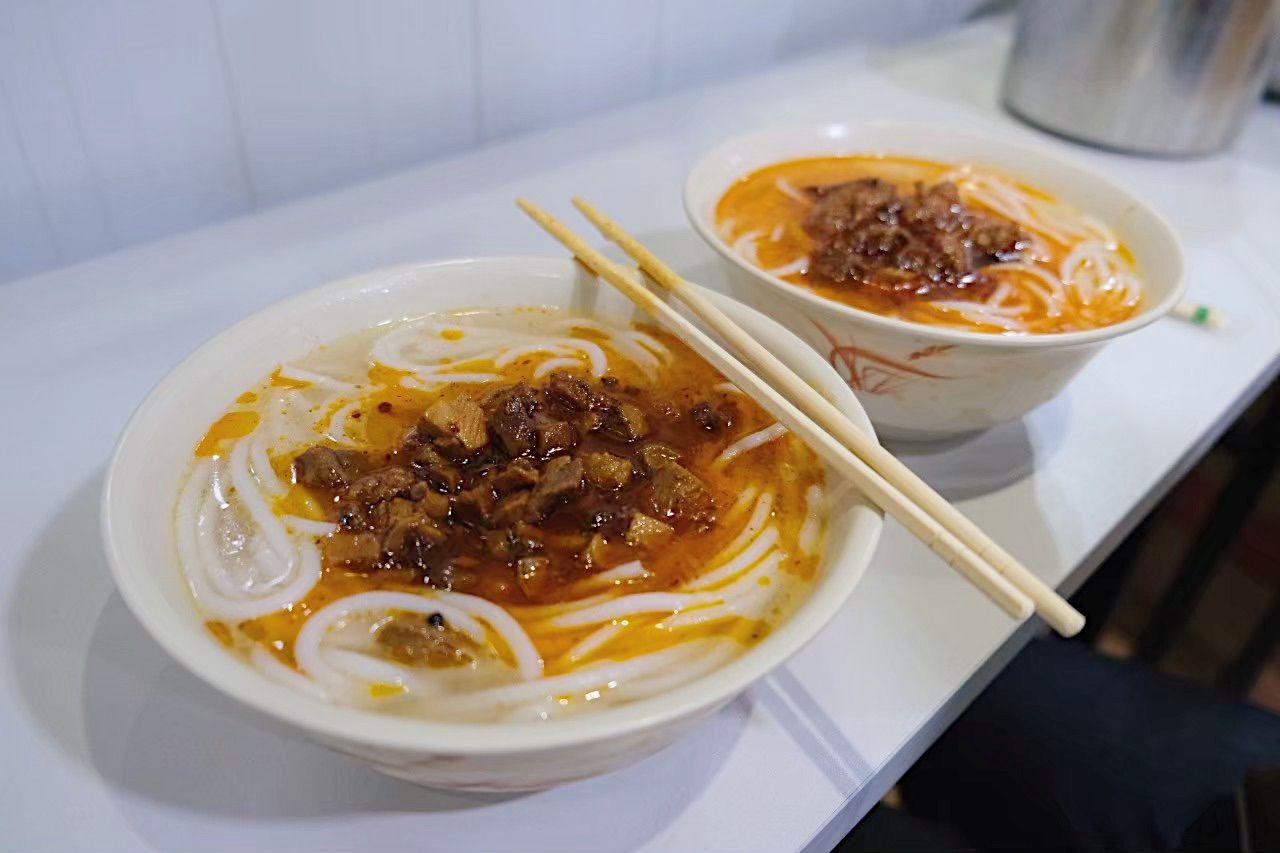 อันนี้รู้สึกเค้าจะเรียกว่า หมี่เซียน มีเส้นให้เลือก 2 แบบ คือ เส้นกลมกับเส้นแบน นี่เลือกเส้นกลมมา รสชาติเหมือนขนมจีนเลย แต่เส้นใหญ่เท่าอุด้ง แล้วก็จะเหนียว ๆ กว่าขนมจีน ที่ราดข้างบนคือ หมูตุ๋นกับไก่ตุ๋นในน้ำซุปหม่าล่าอะ เห็นแดง ๆ งี้ แต่ไม่เผ็ดนะ แล้วเค้าจะมีให้ปรุงข้างนอกเยอะหลายสิ่งมาก มีผักให้ใส่ต่างหากอีก แต่นี่คือไม่ปรุงไรทั้งนั้นจ้า แต่น้ำซุปมันจริงจังมาก แต่ก็นัวมากเหมือนกัน ส่วนเมนูนี้ชามละ 9 หยวน