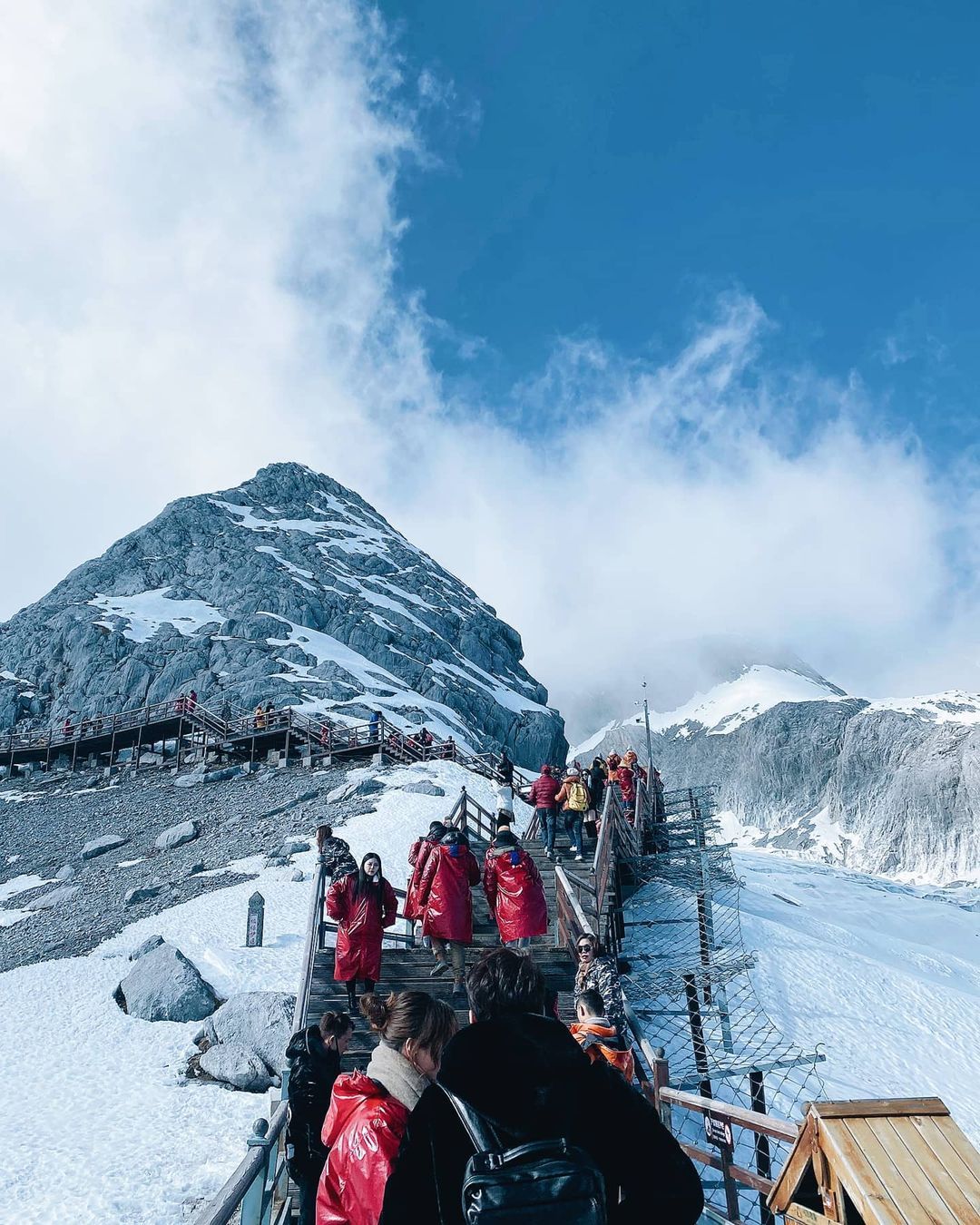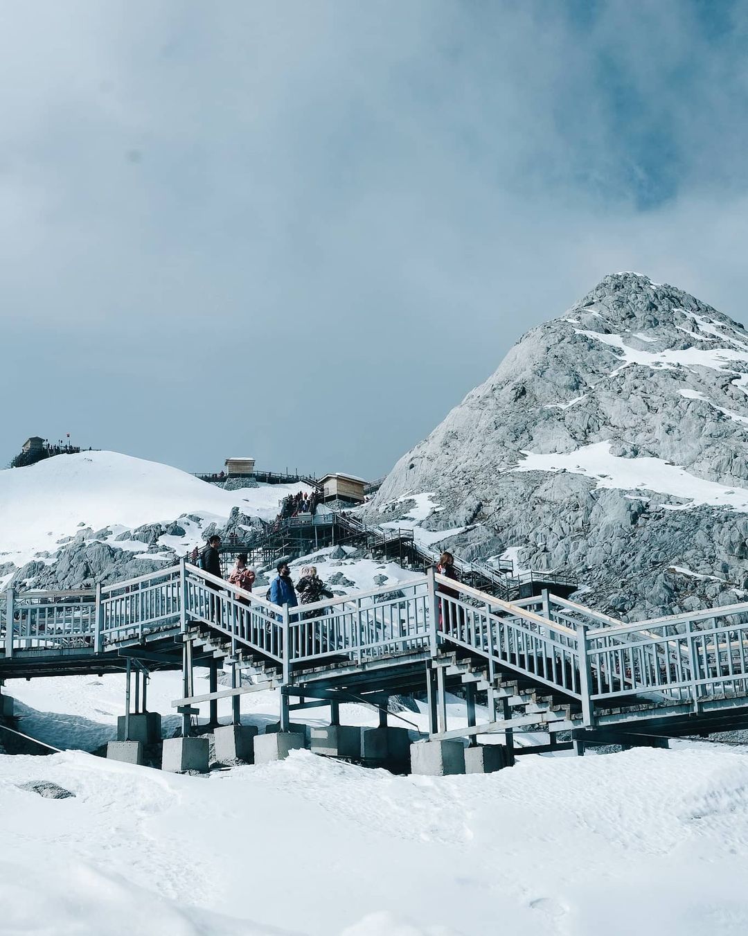 เห็นหิมะขาวทั้งลูกแบบนี้ แต่อากาศอุ่นกว่าตอนเช้า + Blue Moon เยอะมาก เพราะมันแดดออกแล้ว ทางเดินสูงจริง แต่มีบันได ทางเดินดีมาก มีจุดพักถ่ายรูป จุดขายของกินตลอดทาง