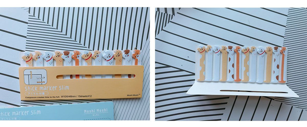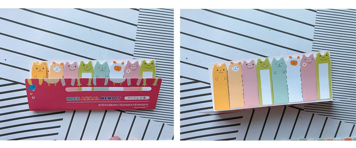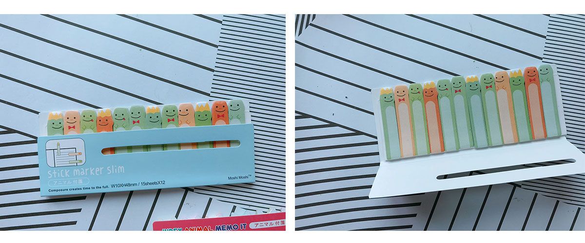 เป็น 3 แบบที่เป็นการ์ตูนน่ารักๆแบบนี้ แต่ที่เหลือก็เป็นแถบสีเฉยๆ น่ารักทุกตัว ใช้ไปไม่กี่ตัวไม่กล้าแกะ เสียดาย 555 ....แต่พอใช้งานจริงๆก็แปะไม่ค่อยติดเท่าไหร่ ไม่แน่ใจว่ามันอาจจะเล็กไป แล้วกาวก็ติดไม่แน่นพอ