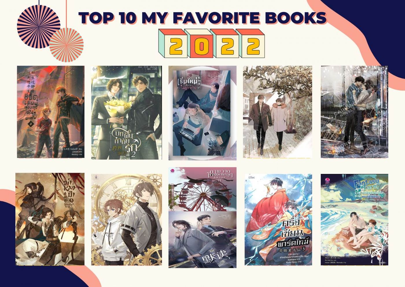 ปี 2022 เป็นปีที่นิยายวายแปลออกเยอะมากกกกกก เรานี่ค่าความเสียหายสูงลิ่วเลยค่ะ แน่นอนว่ายังคงเป็นไปตามชื่อ เรื่องที่ซื้อมาและยังดองอยู่ไม่น้อยเลยจริง ๆ ค่ะ 555555 ในปีหน้าคาดว่าหลายคนคงเห็น LC ที่หลายสนพ.ประกาศและเตรียมเล็งกันไว้แล้ว มาค่อย ๆ จัดลำดับ การพรีไปด้วยกันในปีหน้านะคะ << ไว้อาลัยแก่กระเป๋าสตางค์ใบน้อย