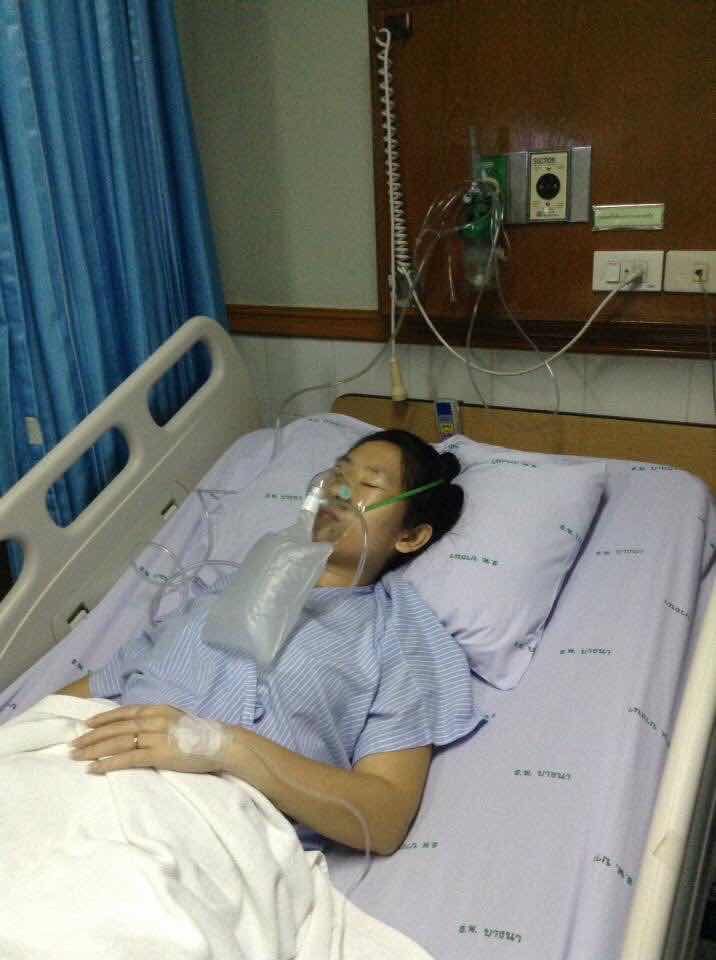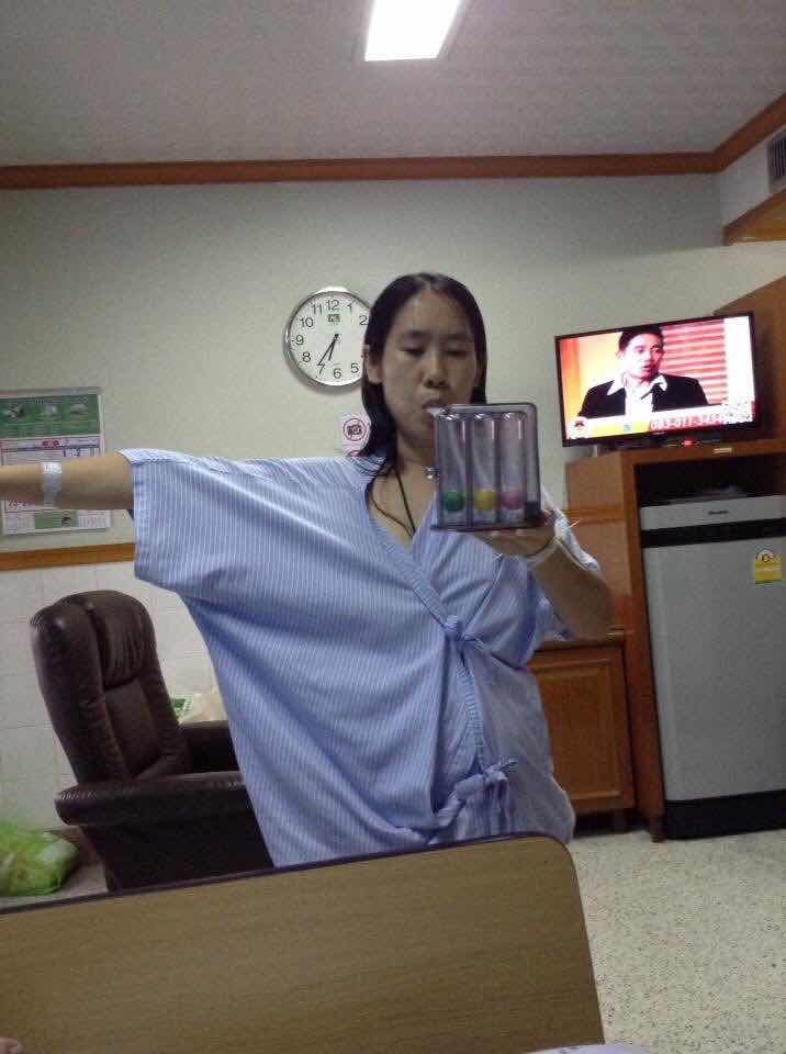 จากนั้นก็วนมาฉีดยา แต่บางเดือนในขณะที่ฉีดยา ประจำเดือนก็จะมาบ้าง แต่อาการที่เพิ่มเติม เรามีอาการแน่นหน้าอกขวา หายใจไมอิ่ม เจ็บสะบักหลังทุกครั้งที่ประจำเดือนมา ก็หาหมอ หมอบอกออฟฟิศซินโดรม กินยาก็ดีขึ้น แต่ทุกเดือน จะเป็นแบบนี้ทุกครั้ง ล่าสุดคือ ปวดร้าวมาที่แขน และแน่นหน้าอก หายใจเข้าลึกๆเจ็บมาก แต่รอบนี้เราไม่ได้ไปหาหมอ เพราะเราไม่อยากกินยาแก้ปวด จึงปล่อยให้เป็นหนักขึ้น จนนอนไม่ได้ พอนอนหงาย กับตะแคงขวา หายใจไม่ออกเลย เราเลยไปหาหมอ เล่าอาการให้หมอฟัง หมอฟังปอด รู้สึกถึงความผิดปกติ จึงส่ง xray ปอด ผล xray หมอบอกปอดแตก หมอตกใจมาก เพราะปอดข้างขวาเราแฟบมาก ถ้าปล่อยไว้จะอันตรายถึงชีวิต หมอรีบส่งตัวเราไป รพ ประกันสังคมซึ่งใกล้ๆกัน พอไปถึงหมอรีบนำเข้าห้องฉุกเฉิน เพราะเราพูดและหายใจไม่ได้แล้วในตอนนั้น เพราะปอดเต็มไปด้วยอากาศ พอเข้าไปห้องฉุกเฉิน ผู้คนมากมายรายล้อมเตียงเราช่วยจับขา จับแขนเรา หมออธิบายว่า หมอจะเจาะบริเวณช่องว่างของซี่โครงเพื่อใส่สายระบายอากาศไปยังเยื่อหุ้มปอดให้ระบายอากาศออก เราก็พยักหน้า คิดในใจ เอาน่าเจ็บนิดเดียว เอาสายเข้าไปแล้วดูดอากาศออกมาก็จบ หมอพูดจบ ก็มีแรงกดตรงซี่โครง กดๆๆ เพื่อดูว่าจะเจาะตรงไหน แล้วก็มีความรู้สึกเหมือนมีดแทง คือนึกในใจ นี่ฉีดยาชาแล้วเหรอคะหมอ เจ็บแทบขาดใจ พอเจาะเสร็จ หมอบอกว่าเดี๋ยวแอดมิดนะครับ งงสิ นึกว่าดูดแล้วกลับได้ พอขยับตัวเท่านั้น โอ้แม่เจ้า สายยางอันใหญ่มากเสียบตรงซี่โครง แถมยังมีขวดแก้วที่ตามตัวอีก 3 ขวด ขยับก็เจ็บมากเหมือนมีดแทงอยู่ชัดๆ ถึงห้องพักต้องให้ออกซิเจนแบบครอบเพราะหายใจเองไม่ได้ พูดไม่ได้ ขยับตัวไม่ได้ เรานอนเป็นผักแบบนั้นอยู่ 3 วันทำได้แค่ลืมตา ผงกหัว นอนตะแคงก็เจ็บนอนหงายจนหลังปวดมาก แต่ทุกเช้าต้องหอบหิ้วตัวเองขึ้นเตียงเพื่อ xray ปอด เจ็บจนไม่มีน้ำตาจะไหล พอวันที่ 4 เริ่มพูดได้ หมอให้ไตรโฟ มาเพื่อเป่า ไล่อากาศออก แต่คือ เป่าแล้วเจ็บตรงสะบักหลังมาก สูบหายใจเข้าทุกครั้งหมือนมีมีดแทงสะบักหลังเจ็บจนน้ำตาไหล แต่หมอบอกนี่เป็นวิธีเดียวที่จะไล่ลมออกจากปอดได้ โดยการทำให้ปอดขยาย เราแอบคิดว่า แค่ใส่สายแล้วมันดูดออกเอง เปล่าเลยค่ะ ตัวเราเองนี่แหละที่ต้องช่วยทำให้ปอดขยาย หมอบอกเจ็บก็ต้องทน ให้เป่าทุกวัน วันละ 300 ครั้ง คือ วันแรก เป่าได้ 5 ครั้งนี้ก็กระอักเลือดละ และตอนเป่าต้องยกแขน คือ เป่าก็เจ็บมากแล้วต้องขยับแขนที่มีเข็มยักษ์คาอยู่ที่ซี่โครง ทรมานสุดๆ มีวันนึงที่ทรมานมาก วันที่7 เรานอนไม่ได้เลยคุณหมอ งดให้ยาแก้