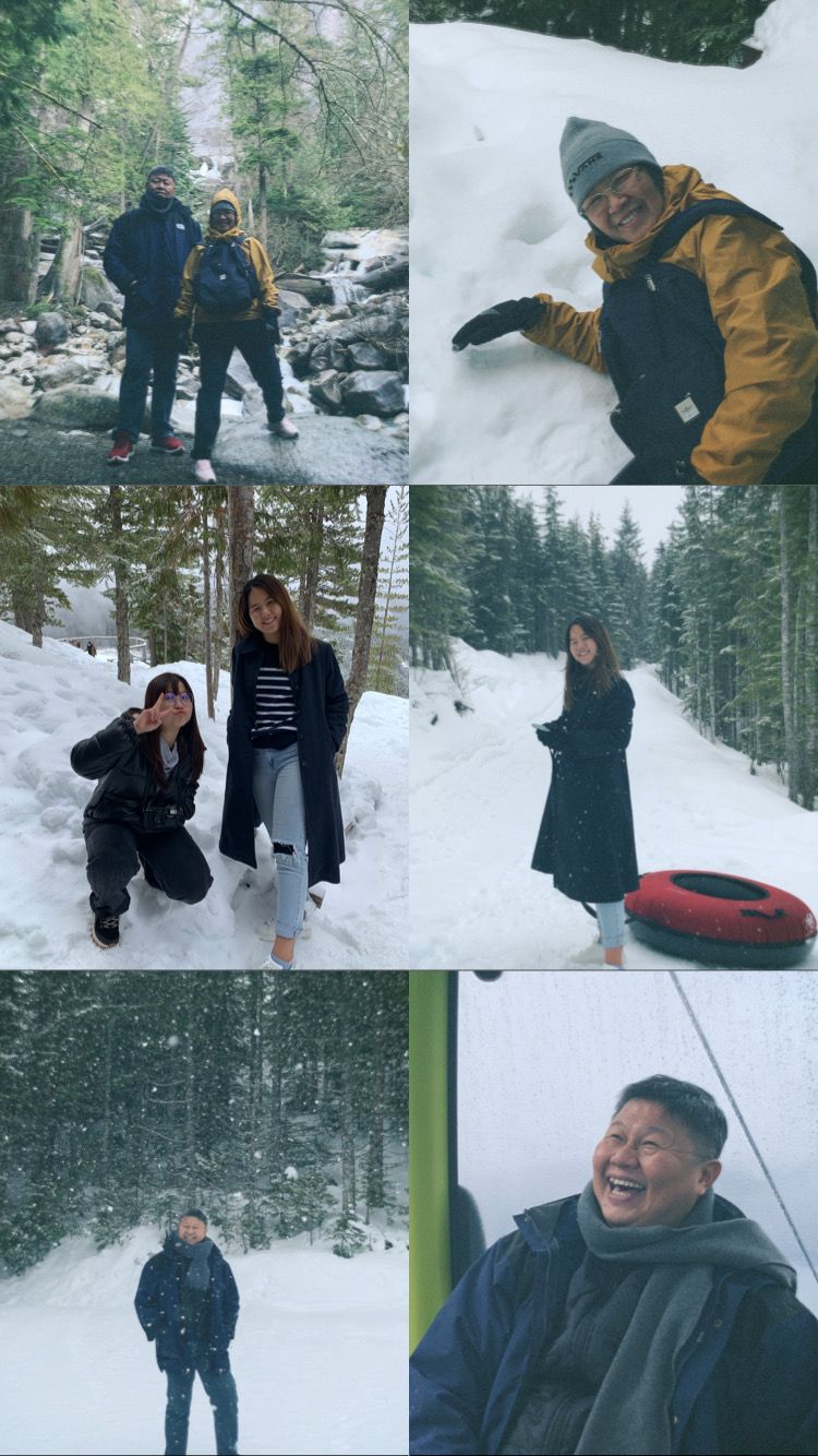 พาทุกคนไป Sea to Sky ค่าเข้าโหดแต่คุ้มมากจริง ๆ ตอนนั่งกระเช้าขึ้นไปคือไกลม๊ากกก สิ่งที่เห็นไม่ใช่สิ่งที่เป็นสุด ๆ ข้างล่างคือ sea และพวกเราทะยานไปเหนือ sky สูงแบบป๊าเสียวตู๊ดเลย พอเราถึงข้างบนสักพักหิมะเริ่มตก แปลกใจเหมือนกันเพราะข้างล่างหิมะไม่ตกแล้ว ทุกคนเลยได้เห็นหิมะที่สวยมากจริง ๆ เพราะข้างบนวิวสวยมากกกกก แม่เดินข้ามสะพานไปคนแรก แล้วต่อด้วยบีมกับเจ๊ มันไม่ได้น่ากลัวนะ ไม่ได้เล็กขนาดนั้น พวกเราแฮปปี้กับที่นี่สุด ๆ เรานั่งเล่น นั่งกิน เดินไปเดินมาสักพัก บีมเห็นว่ามี Tube ให้เล่น ชวนเจ๊ไปเล่น ไม่ค่อยมีคนเลยวันที่ไป มีครอบครัวนึงที่มีเด็ก ๆ 3-4 คนเล่น แค่นั้น เราเสีย $5 เล่นได้ไม่จำกัด บีมกับเจ๊เล่นรอบแรกแบบไปด้วยกันก็สนุกแล้ว แต่เราสามารถขอเค้าให้หมุนได้เลยให้เจ๊ไปรอบสอง แต่คนที่ปล่อยพวกเราบอกว่าพี่สาวยูไปแล้วยูจะไม่ได้หรอ มันไม่แฟร์นะ บีมแบบห้ะ เมื่อกี้ไม่ใช่แบบนี้นี่หน่า แต่สุดท้ายก็ไปด้วยแรงยุ 55555 ถือว่าสนุกแบบมึน ๆ เปียก ๆ หนาว ๆ (ไว้กลับมาเล่นกันใหม่นะ)