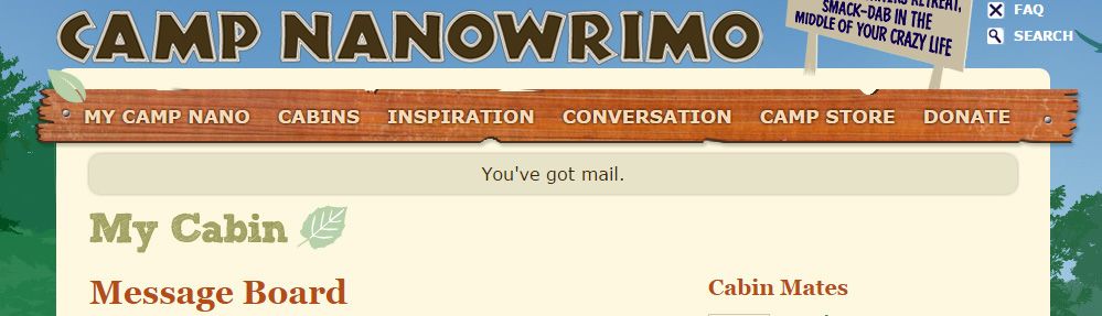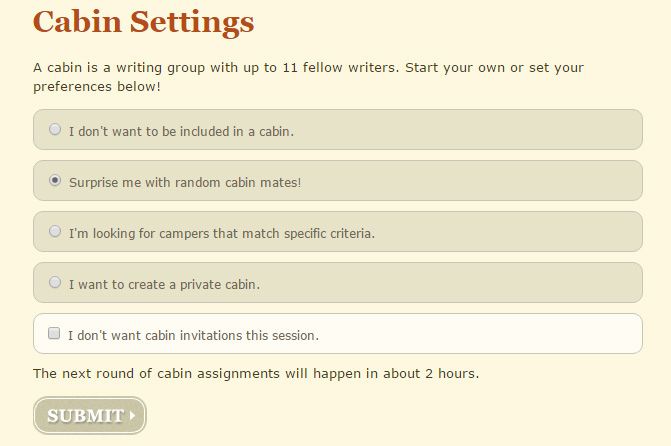 เดี๋ยวๆๆ งานประจำเดือนพฤศจิกายนมาบอกอะไรตอนนี้ล่ะ? พอดีนอกจากกิจกรรม NaNoWriMo ที่จัดปกติแล้ว ยังมีกิจกรรม Camp NaNoWriMo ด้วยทุกๆ เดือนเมษายนและกรกฎาคม ซึ่งกิจกรรมนี้เป็นการรวมกลุ่มคนได้สูงสุด 12 คนมาอยู่ในบ้าน (cabin) เดียวกัน เหมือนเวลาไปตั้งแคมป์มีการแบ่งกลุ่ม แบ่งที่พักไงล่ะ พอมีกลุ่มก็รวมหัวกันเขียนงานตัวเอง งานที่เขียนไม่จำเป็นต้อง 50,000 คำ จะมากหรือน้อยกว่านี้ก็ได้ แถมนอกจากจะชวนเพื่อนมาตั้งบ้านแบบไพรเวทอยู่ด้วยกันแล้ว ยังให้ระบบแรนด้อมเราให้ไปอยู่บ้านอื่นได้ด้วย จะเลือกให้อยู่ในกลุ่มคนอายุเดียวกันหรือเขียนงาน genre เดียวกันก็ได้