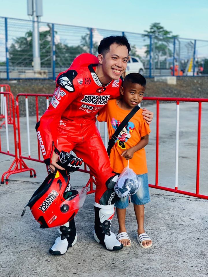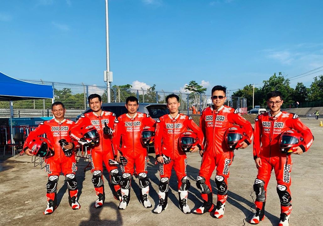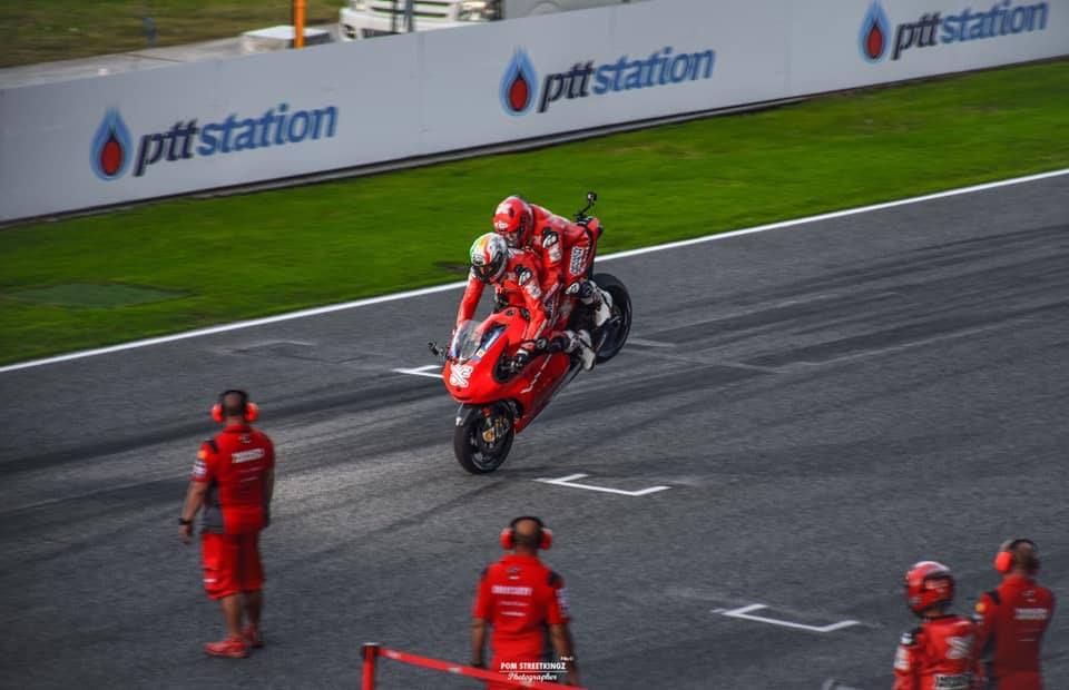คือสิ่งที่เราเห็นจริงๆก็ไม่ใช่สนามหรอก ภาพ 70% จะเป็นหลังนักแข่งมากกว่า ซึ่ง ไม่ต้องเสียดายไปครับ ปกติเราไม่มานั่งคิดเรื่องนี้แน่นอน คือ ณ จุดนั้น ใครถามร้อนมั้ย เห็นอะไรยังไง เข่าถึงพื้นมั้ย บอกเลยในหัวมีเรื่องเดียวคือ กลัว กังวล และ แมมเมื่อไหร่จะจบวะ เห็นคนอื่นวิ่งแปบเดียวทำไมตอนตรูนานแบบนี้ ตอนแรกกลัวทางโค้ง แต่ เอาจริงจุดที่พานิคสุดคือทางตรง พี่อัด กี่เกียร์ไม่รู้แบบ ตุ้ม ตู้ม ตู้มมม แล้วถึงโค้งแมมก็เบรคอย่างหน่วง โค้ง นี้ไม่รู้ว่าเข่าใกล้พื้นขนาดไหนแต่ที่รู้คือ หน้ามองพื้นชัดมาก เห็น ลวดลายขาวฟ้าสลับกันไปอย่างชัดเจน (ขอบถนน) เลี้ยวทีก็กังวล ภาพลอยมาคือรถไถล ออกไป นี่ตรูเอนได้ตามองศาพี่แกมั้ยวะ แล้วแมมเสื้อกมาหลุดไถลตอนเรา อิตอนเช้าฝนแมมก็เพิ่งตก ทั้งหมดนี้เป็นความคิดที่วิ่งเข้ามาซึ่งเป็นสิ่งเดียวที่เร็วกว่ามอไซต์ในขณะนั้นที่สัมผัสได้ เอาเป็นว่า ความมั่นใจในความแข็งแรงของร่างกาย มลายหายไปเลย เรสเป็คนักแข่งทันที คือต้องแข็งแกร่งขนาดไหน แล้วทรงตัวดีเท่าไร ถึงทำมุมนั้นได้ และพยุงรถที่หนักกว่า 160kg ด้วยความเร็วแบบนั้น นี่ยังไม่นับตัวห้อยท้ายอย่างเราที่ เป็นภาระอีก แต่ด้วยความเป็นมืออาชีพของเค้า คือ บอกเลยว่าเมิมคิดแต่เรื่องเมิมเถอะ เรื่องเค้าจะยังไงไม่ต้องกังวลมันซ้อนมาเป็นพันคนแล้ว ไม่มาฟลุคที่เราหรอก คิดว่า งั้นสติ สตังค์ เลยเถิดแน่ พอมานั่งนึกตอนนี้ก็ไม่ค่อยออกนะครับ จำได้ประมาณนี้รู้แค่ว่า มันคิดเรื่อง พวกนี้ไปมาเยอะมาก กุมาทำอะไรที่นี้ จะปล่อยมือดีมั้ย จะล้มมั้ยวะถ้าเอนผิด ใกล้พื้นไปแล้วสึส ไม่ไหวแล้ว เมื่อไหร่จะจบ อิสัสพากุลงที เมิมเอาเร็ว 80 ก็ได้ วกวนไปมา จำข้างทางไม่แม่น แต่ความรู้สึกค่อนข้างจำได้ จบ LAP ด้วยการ ยกล้อ พาขึ้นสู่ยอดเสา ก็ถือว่าเก็บครบทุกกระบวนท่า ยกล้อหน้า ล้อหลัง ขาดก็แต่ 2 ล้อพร้อมๆกัน ซึ่งนับว่า ดีที่ไม่มีเหตุการณ์นั้น . . .