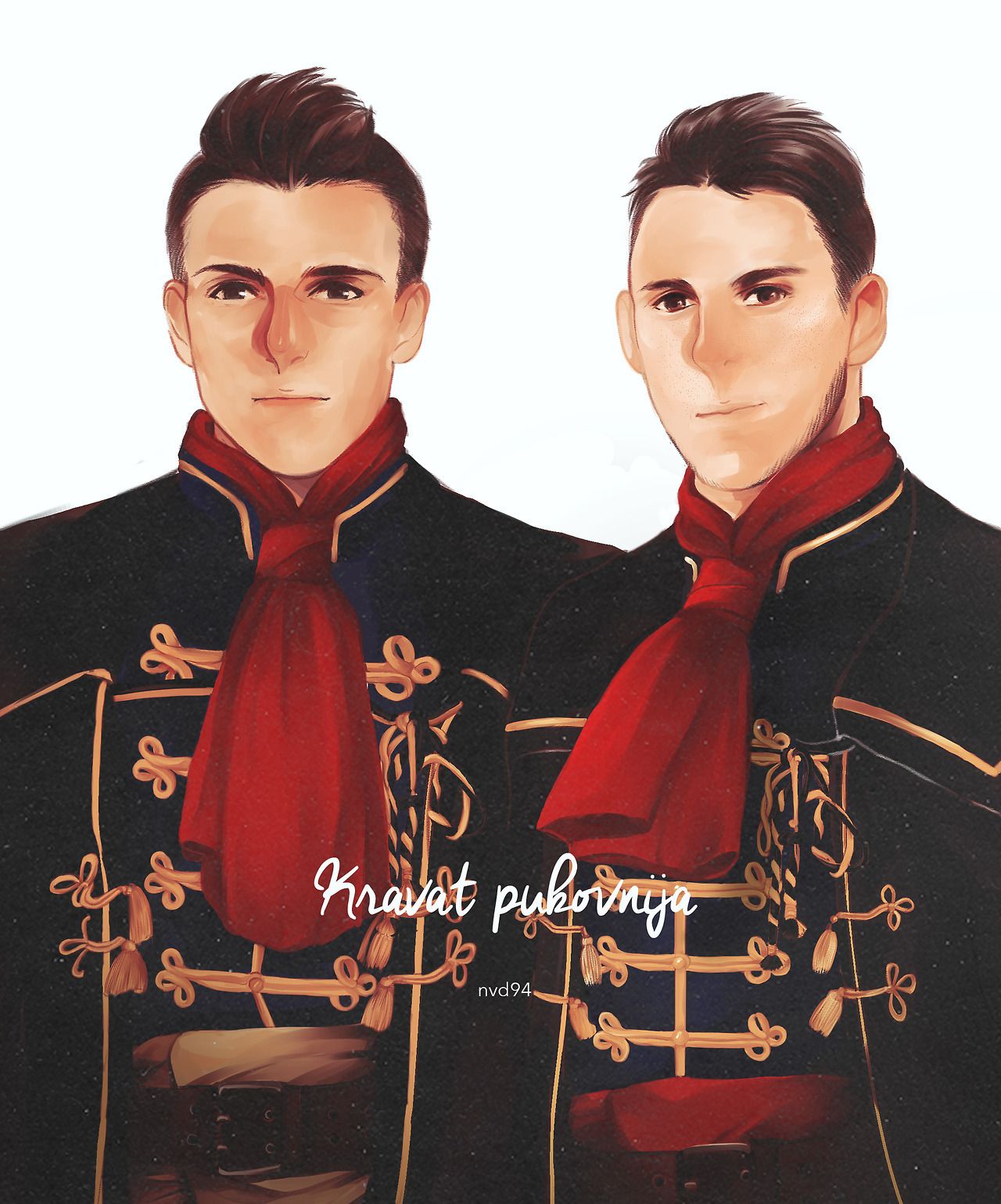 ชุดนี้มีแบคกราวนด์เล็กน้อย เพราะเป็นชุดของทหารโครเอเชียในศตวรรษที่ 17 ร่วมรบในสงครามสามสิบปี ส่วนผ้าที่พันคอ(kravat)ในรูปเป็นต้นกำเนิดของเนคไทในปัจจุบัน เพราะตอนไปรบพวกชนชั้นสูงฝรั่งเศสชอบเลยผูกตาม ทุกวันนี้ที่ซาเกร็บก็ยังมีกองทหารที่จะแต่งตัวแบบนี้ลาดตระเวณอยู่ด้วย จะเดินทุกๆวันหยุดสุดสัปดาห์ ตั้งแต่เดือนเมษาถึงตุลา