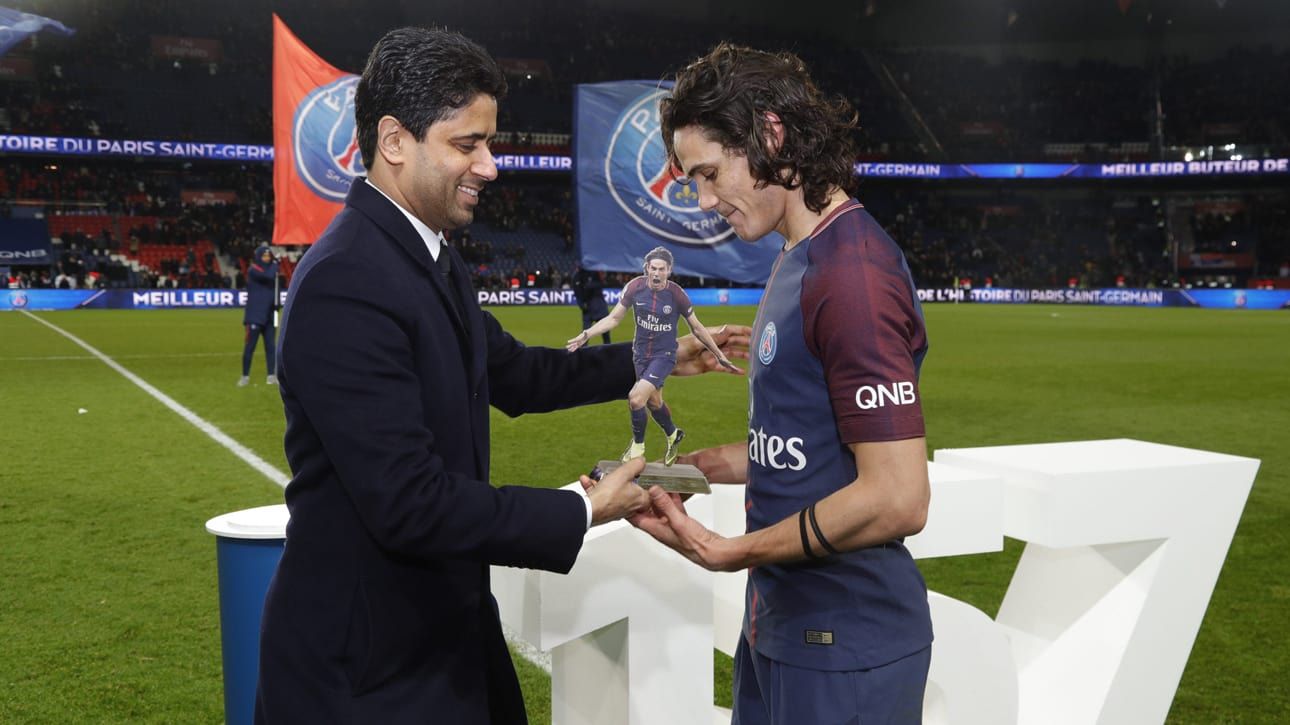 ท่านประธานนาซเซอร์ อัลเคไลฟี่กับการมอบรางวัลดาวซัลโวประจำทีมแก่เอดินสัน คาวานี่ (เครดิต : C.Gavelle)