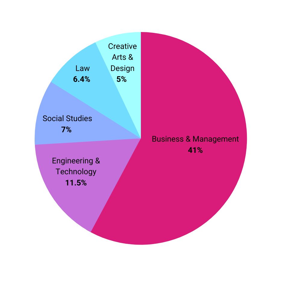 คณะหรือสาขา ยอดนิยมในกลุ่มนักศึกษาจากประเทศไทยทั้งระดับปริญญาตรีและปริญญาโท คือ Business and Management หรือบริหารการจัดการธุรกิจ, Engineering and Technology (วิศวกรรมและเทคโนโลยี), Social studies (สังคมศาสตร์), Law (กฎหมาย) Creative arts and design (ศิลปะและออกแบบดีไซน์)