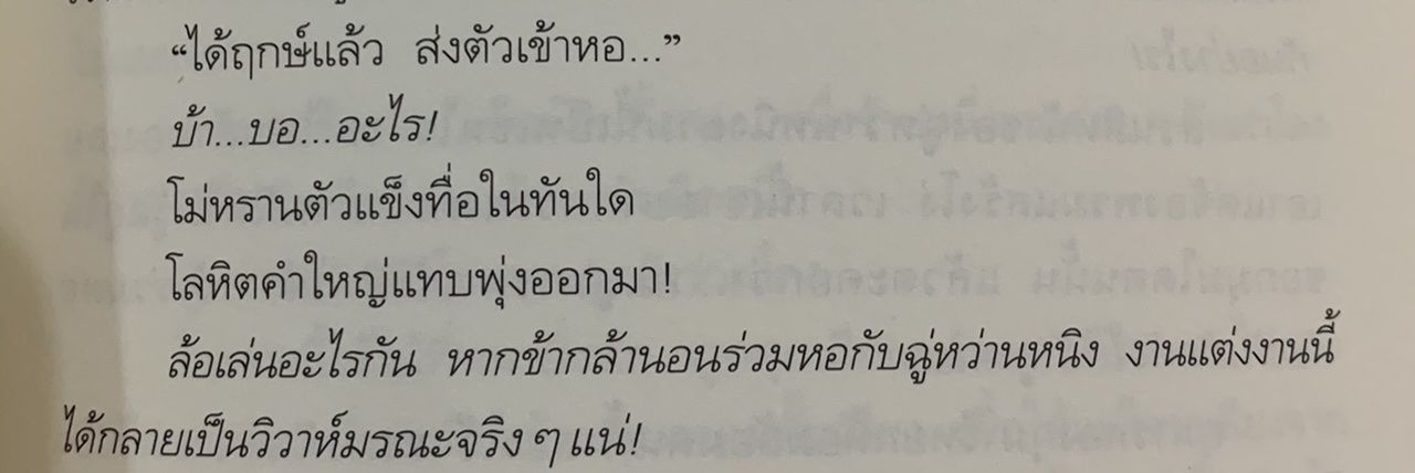 - ชอบตอนไปปราบปีศาจนะ สนุกดี คิดว่าคงมีมาเรื่อยๆ อย่างตอนวิวาห์มรณะในเล่มนี้ก็สนุก แล้วตอนท้ายก็ค้างจ้ะแม่ กำลังจะไปตามหาตัวคนร้ายพอดีแบบว่าเพิ่งออกจากกลลวงได้ ค้างมาก