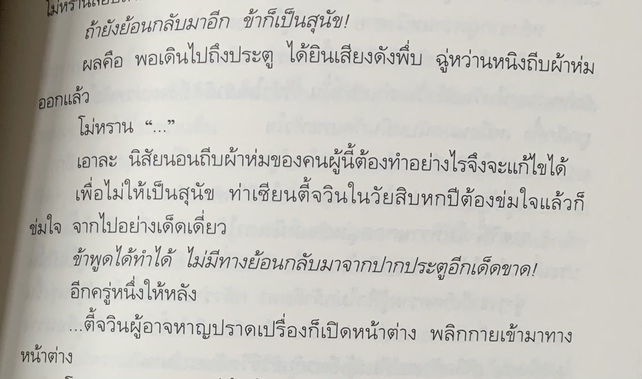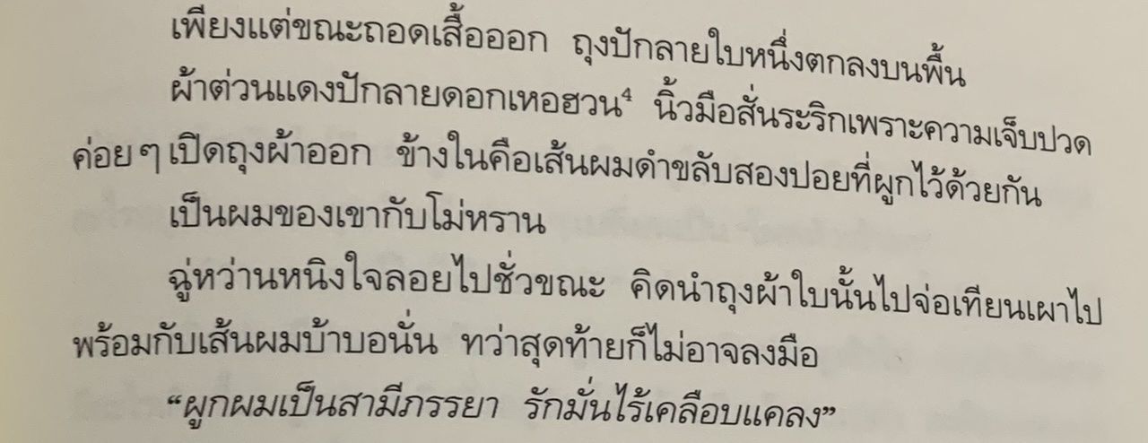 - ตอนแรกก็กล้าๆกลัวนะที่จะอ่านเพราะเห็นwarningแบบว่าเป็นหน้า แต่พออ่านไปแล้วก็โอเคเล่มนี้ยังไม่ได้ขนาดนั้น ยังแบบว่าถ้าอ่าน S.C.I. ได้ เรื่องนี้ก็สบายอะ เรื่องนั้นหนักกว่า เรื่องนี้มันหนักตอนที่เป็นชาติที่แล้วของโม่หร่าน ส่วนชาตินี้ที่หนักคือความคิดแหละเพราะตอนนี้คิดได้อย่างเดียว พูดออกมาไม่ได้เดียวโดนฉู่หว่านหนิงฟาดแน่นอน
