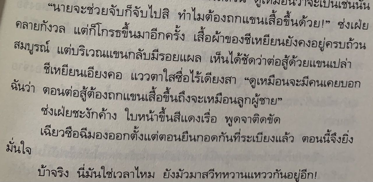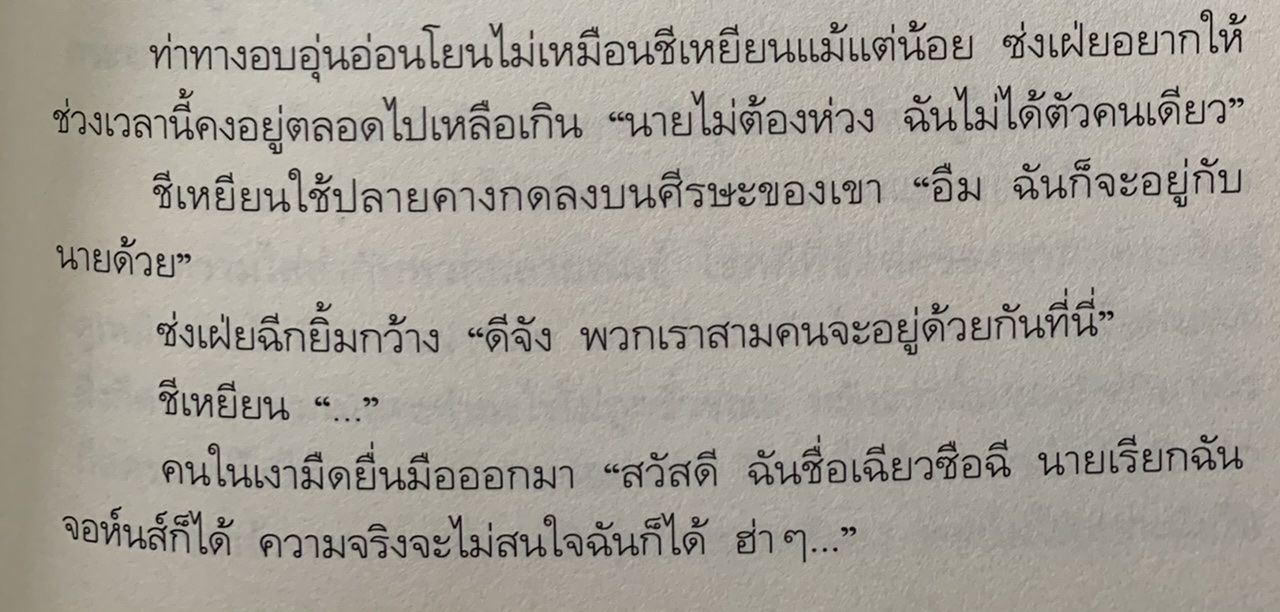 ทีนี้พอซ่งเฝ่ยตัดใจได้ทางชีเหยียนก็แบบเอาแล้วไง อยากคืนดีอะแต่อีกฝ่ายปล่อยผ่านแล้วจะทำไง คงต้องรออ่านเล่มต่อไปว่าชีเหยียนจะจุดไฟเก่าได้หรือเปล่า