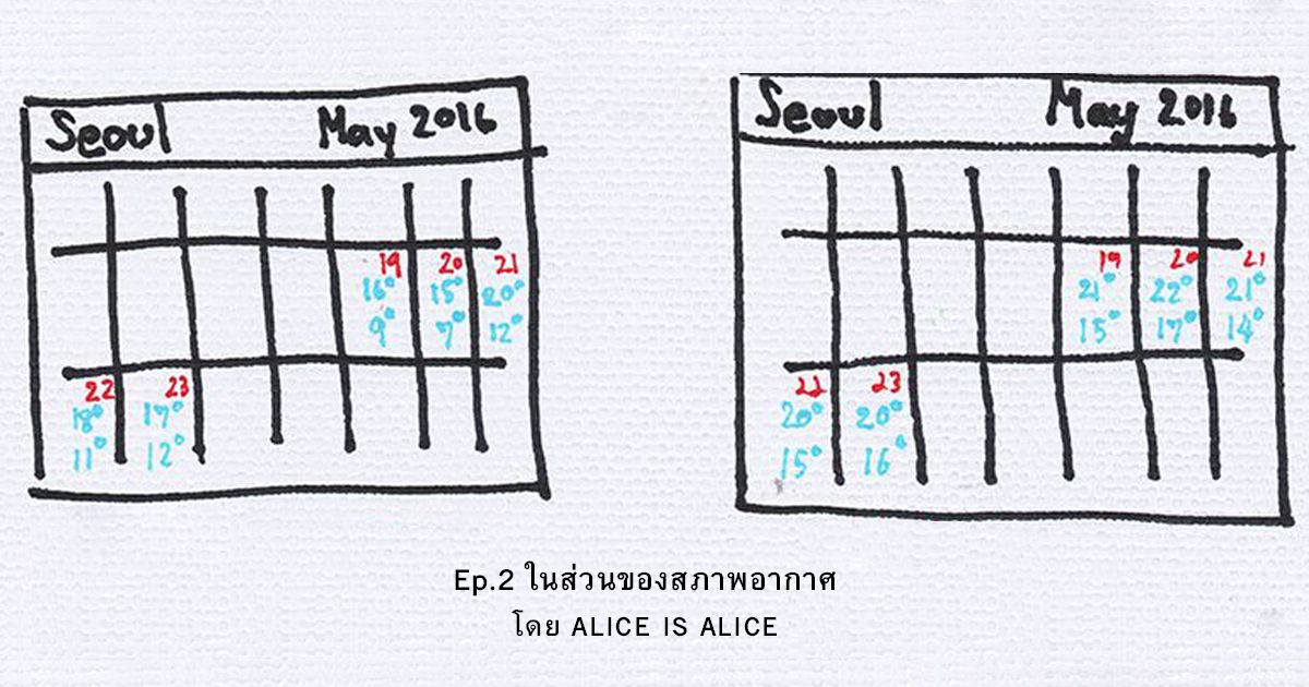 Ep.2 ในส่วนของสภาพอากาศ โดย ALICE IS ALICE มีคนต่อยอดไอเดีย 30 Day Challenge กันหลายคนเลย ไอเดียกระฉูดกันใหญ่เลยใช่ม้าา *ถือพู่เชียร์* แต่ละคนเขียนกันน่าอ่านมาก ของคุณ ALICE IS ALICE ก็น่าสนใจนะ คือเอาไอเดีย 30 วันมาเล่นกับการรีวิวไปเที่ยวเกาหลี แบ่งเป็น 30 ตอน ตอนนี้ก็มีตอนใหม่ๆ ออกมาแล้วด้วย น่ารักตั้งแต่ตอนแรกเลย มีการแนะนำตัวละครแถมยังมีภาพประกอบกุ๊กกิ๊กในแต่ละตอนอีก มาร่วมติดตามกันใน 30 วันนี้ดีกว่าว่าทริปนี้จะสนุกแค่ไหน! เผื่อใครอยากไปบ้างก็จะได้เก็บข้อมูลไว้ *เตรียมเปิดเว็บจองตั๋วเครื่องบินและโรงแรม ฮิฮิ*