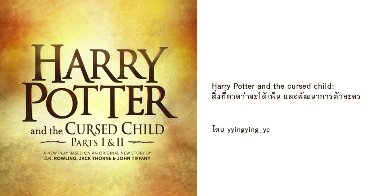 Harry Potter and the cursed child: สิ่งที่คาดว่าจะได้เห็น และพัฒนาการตัวละคร	โดย	yyingying_ycใครชอบแฮร์รี่ พอตเตอร์ยกมือขึ้น! *ยกมือ* แฟนๆ แฮร์รี่คงอดพูดเรื่องตัวละครแฮร์รี่ภาคใหม่เวอร์ชั่นละครเวทีที่เป็นเรื่องอนาคตของแฮร์รี่ 16 ปีให้หลังไม่ได้ คุณ yyingying ก็ได้มาบันทึกความคิดต่อตัวละครทรีโอ้ตั้งแต่เวอร์ชั่นหนังปีแรกๆ จนถึงอนาคตของตัวละครพวกนี้ในภาคใหม่ล่าสุดนี้เลยก่อนที่เราจะได้อ่านบทละครในสิ้นเดือนหน้าว่าอยากรู้จะเป็นยังไง มาเดาไปพร้อมๆ กันดีกว่า แต่ใครรู้แล้วก็ จุ๊ๆ #keepthesecrets จนกว่าจะถึงวันขายจริงนะ!