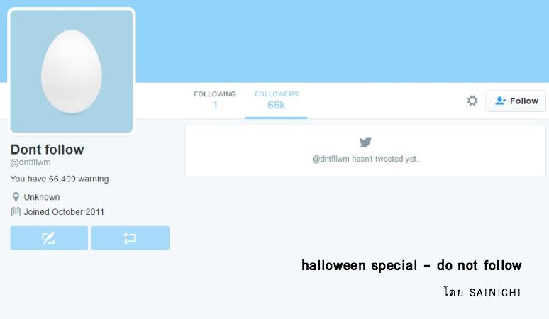 เล่นทวิตเตอร์กันปะ? ถ้าเล่นลองเข้าไปหา acc นี้สิ คุณ sainichi บอกว่า ถ้าไปฟอลโลว์แอคเคาทน์นี้แล้ว...เรื่องลึกลับจะเกิดขึ้น เป็นเรื่องที่เราคาดไม่ถึง และบางทีอาจจะไม่อยากให้เกิดขึ้นกับตัวเองด้วย ลองแล้วเป็นไง ถ้ามีโอกาสได้กลับมาเล่าให้มินิมอร์ฟังก็เล่าเนอะ