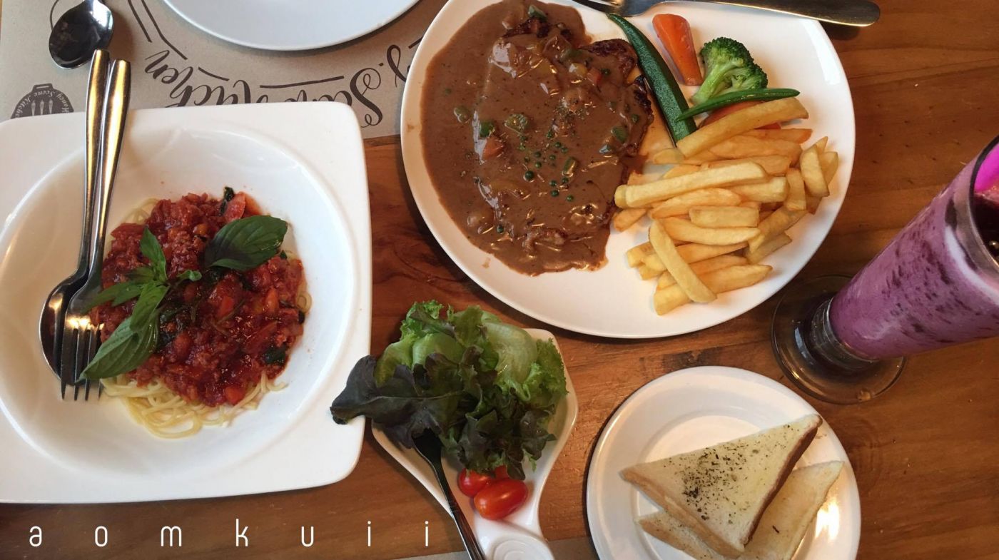 สเต็กหมูพริกไทยดำ(อ่านรีวิวมา)และสปาเก็ตตี้เนื้อซอสมะเขือเทศ(เลือกตามแฟนชอบ)