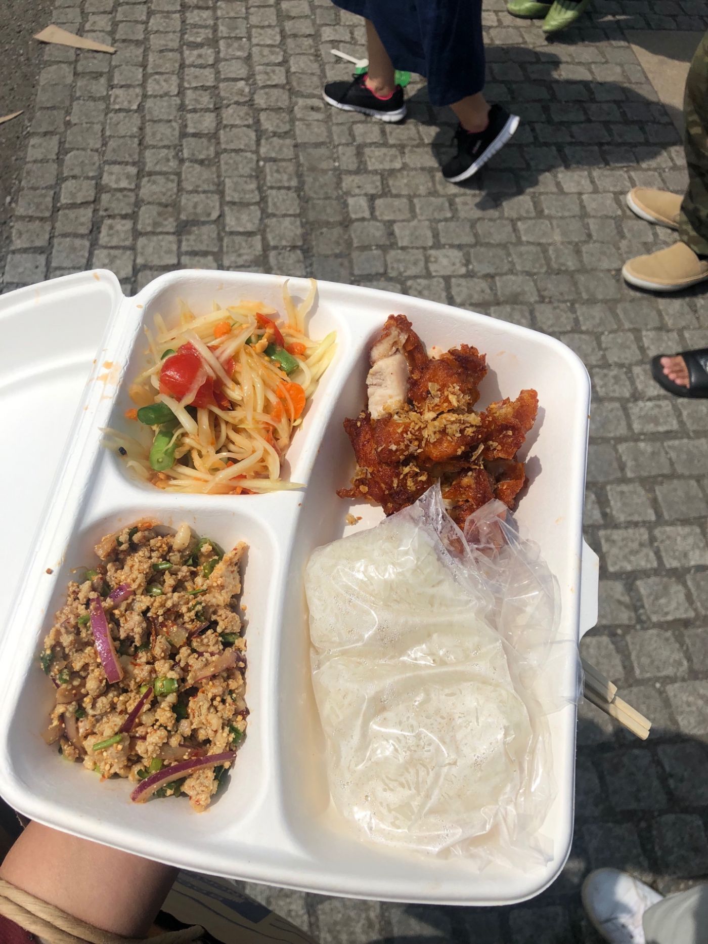 ที่งานมีบูธอาหารไทยให้เลือกเยอะเลย ไม่เคยรู้สึกอยากกินอาหารไทยขนาดนี้มาก่อนจนกระทั่งวันนี้นี่แหละ ที่ผ่านมาก็กินแต่ราเมง โซบะ ข้าวหมูทอด เทมปุระวนไปเรื่อยๆ มาวันนี้ได้กินส้มตำซักที เป็นอาหารไทยครั้งแรกตั้งแต่มาอยู่นี่ ร้านที่เราซื้อได้ Michelin Star ด้วยแต่รสชาติก็ยังไม่อร่อยเท่าร้านส้มตำแถวบ้านที่ไทยอยู่ดี ทั้งเซ็ต 1000 เยน หรือเกือบ 300 บาทเลย