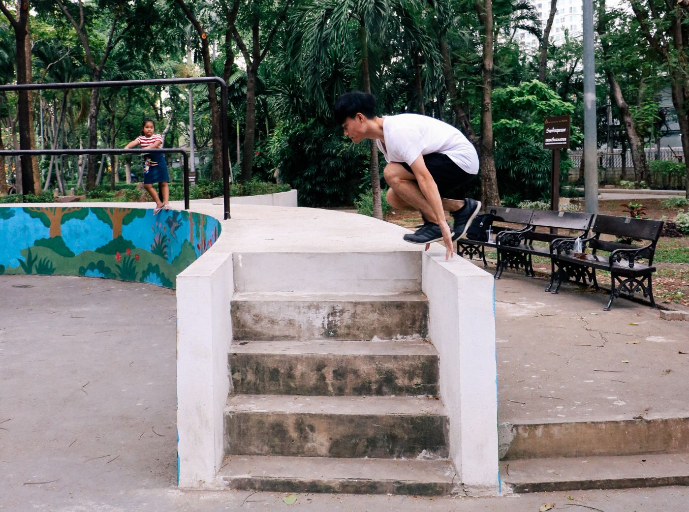 ผมวิ่งจากระยะที่พอดีเข้าไปใกล้กำแพงที่สูงประมาณเอว ใช้สองมือยื่นออกไปตบลงบนขอบกำแพงยันตัวเองขึ้นพร้อมกระโดดเก็บเข่าทั้งสองชิดตัว แรงกระโดดและแรงยันจากมือที่ตบลงบนขอบกำแพงส่งผมกระโจนไปข้างหน้า ผ่านช่องว่างตรงกลางจนไปยืนอยู่อีกฝั่งหนึ่งของกำแพงสำเร็จ