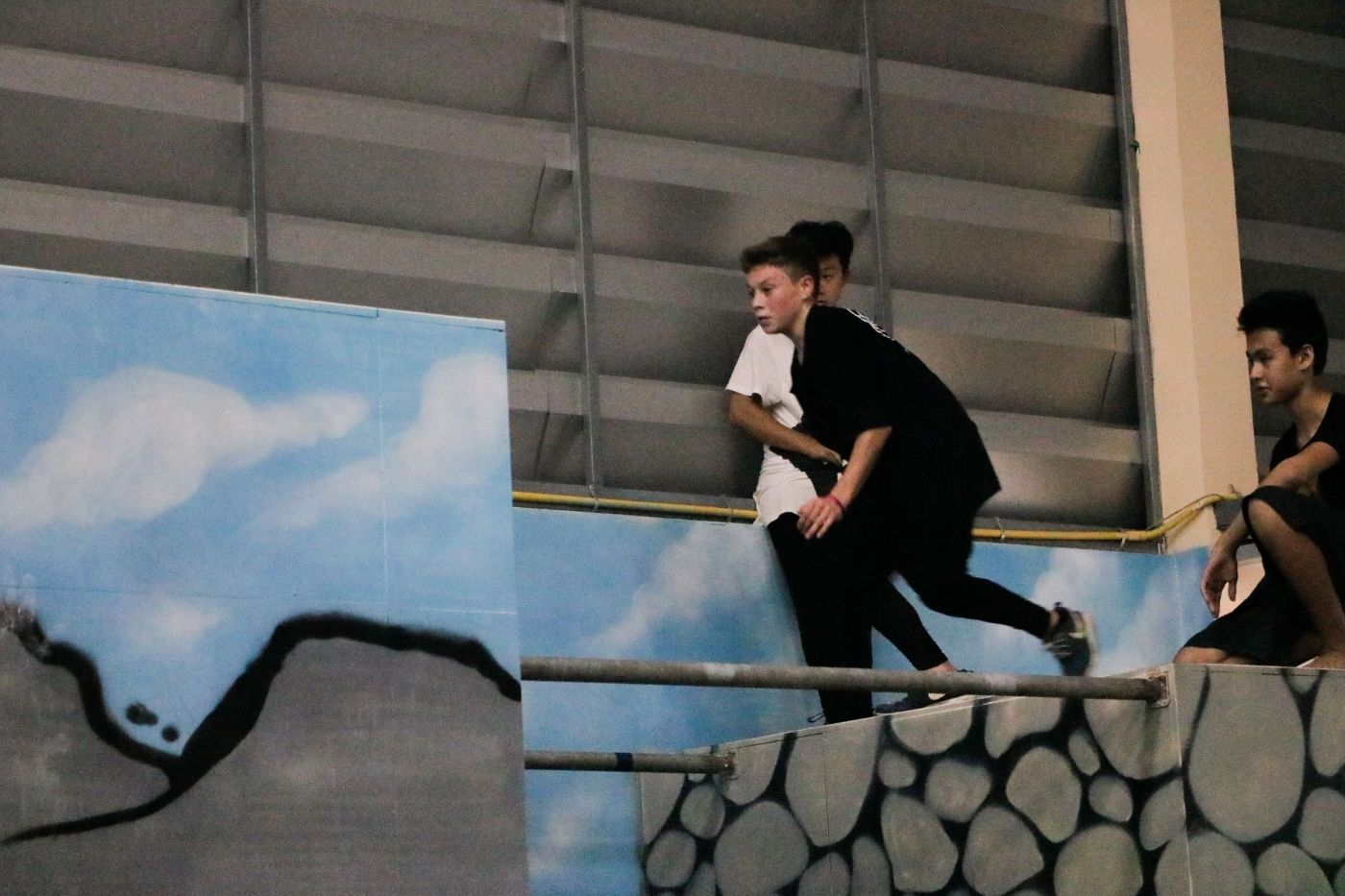 ยิมแห่งนี้แบ่งพื้นที่ออกเป็นสามส่วน ส่วนแรกจะมีโครงเหล็กที่เอาไว้ฝึกโหนและกำแพงสูงสำหรับฝึกปีน รวมถึงแท่นไม้ต่างๆ ไว้ให้ฝึกกระโดด ส่วนที่สองจะเป็นพื้นที่โล่งๆ ที่ปูด้วยเบาะไว้ตีลังกา ส่วนที่สามเป็นแทรมโพลีน