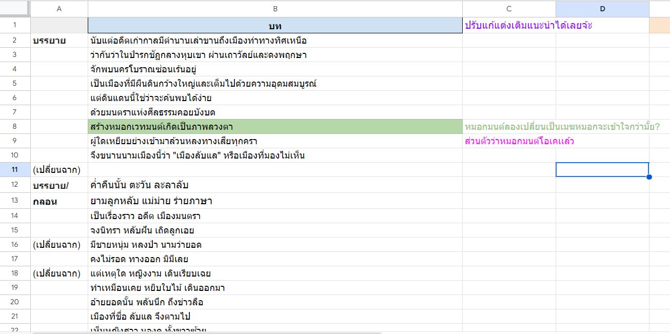 ฉันผลัดวาดรูปบ้าง ทำแอนิเมชันในโปรแกรม Ae (Adobe After Affect) บ้าง และนำไปตัดต่อเป็นคลิปในโปรแกรม Pr (Adobe Premiere pro) แต่ยังทำได้เพียงแค่เนื้อหาส่วนที่เพิ่งเริ่มเข้าเมืองเท่านั้น ซึ่งฉันก็พยายามที่จะทำให้สมบูรณ์เท่าที่จะทำได้เพื่อทำไปให้เด็ก ๆ กลุ่มเป้าหมายรับชมและฟังความคิดเห็น
