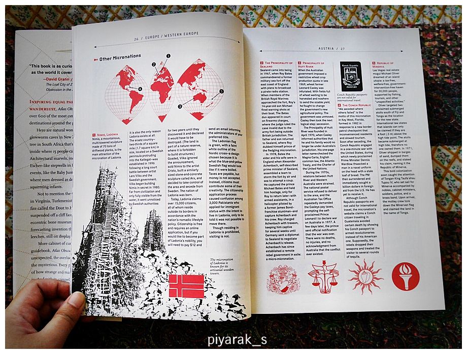 สำหรับ Atlas Obscura ที่เป็นหนังสือ จะเป็นส่วนของแอตลาสผสมกับ stories โดยเฉพาะส่วนที่เป็นแผนที่ค่ะ เป็นหนังสือปกแข็ง หนาเอาเรื่อง ราคาก็แพงใช้ได้ แต่อยู่ในระดับมาตรฐานของพวกสารานุกรมปกแข็งทั้งหลาย คิดเป็นเงินไทยพันกว่าบาท ยังไม่มีแปลเป็นภาษาไทย หาซื้อได้ใน book depository หรือ คิโนะคุนิยะ